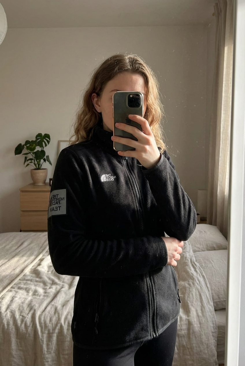 Veste Polaire Jacket Fleece The North Face Team Circular design Noir XS debout, face à la caméra, dans une chambre à la lumière douce, avec une lumière naturelle filtrant par la fenêtre.