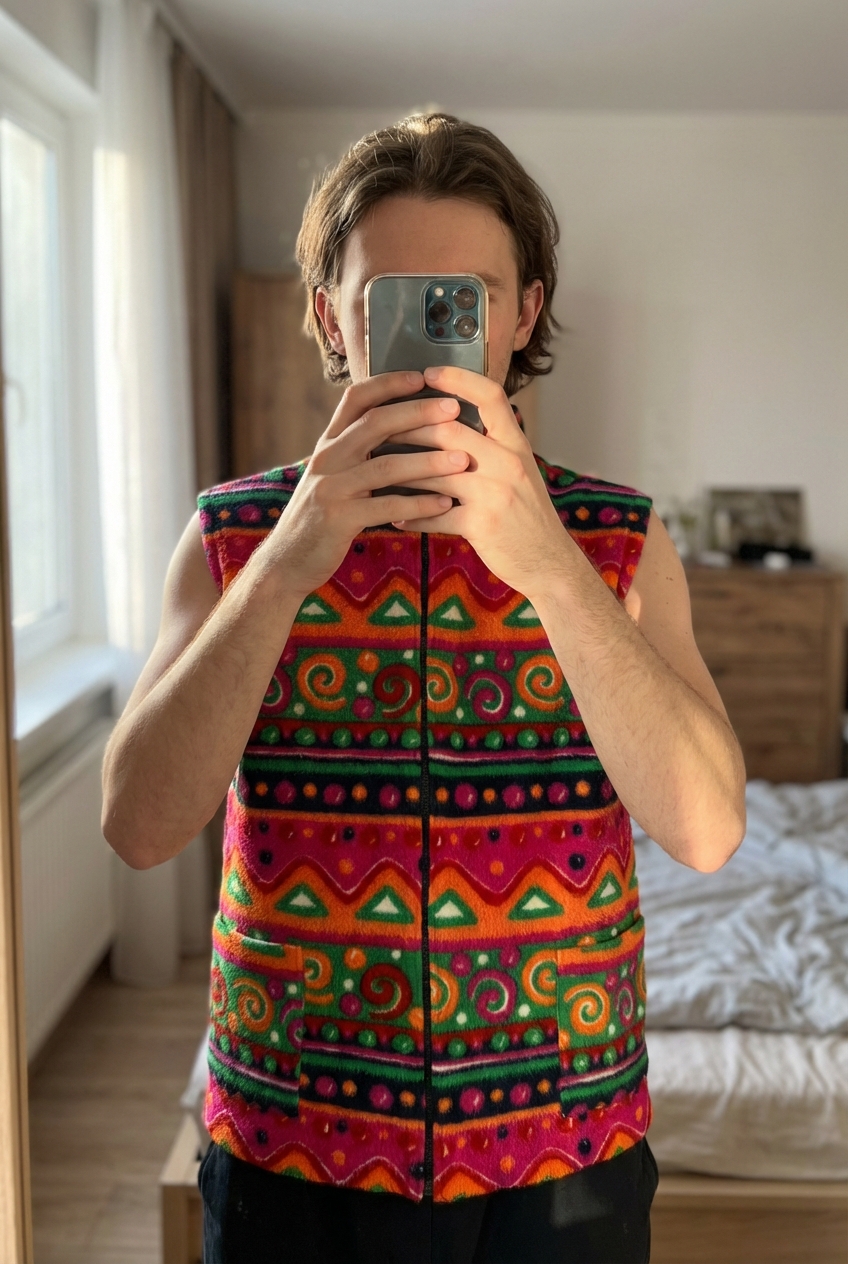 Une personne en Veste Polaire Sans Manche Crazy Fleece Vintage Y2K Crazy patern Fuchsia Rouge M Oversize debout, face à la caméra, dans une chambre à la lumière douce, avec une lumière naturelle filtrant par la fenêtre.
