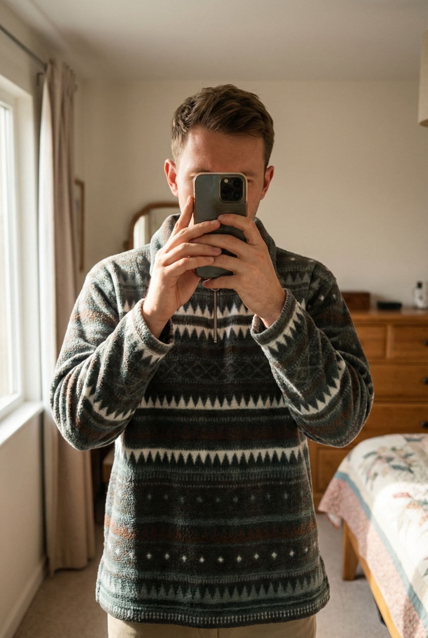 Une personne en Veste Polaire Sherpa Crazy Fleece Vintage Y2K Norway patern Kaki et Gris L debout, face à la caméra, dans une chambre à la lumière douce, avec une lumière naturelle filtrant par la fenêtre.