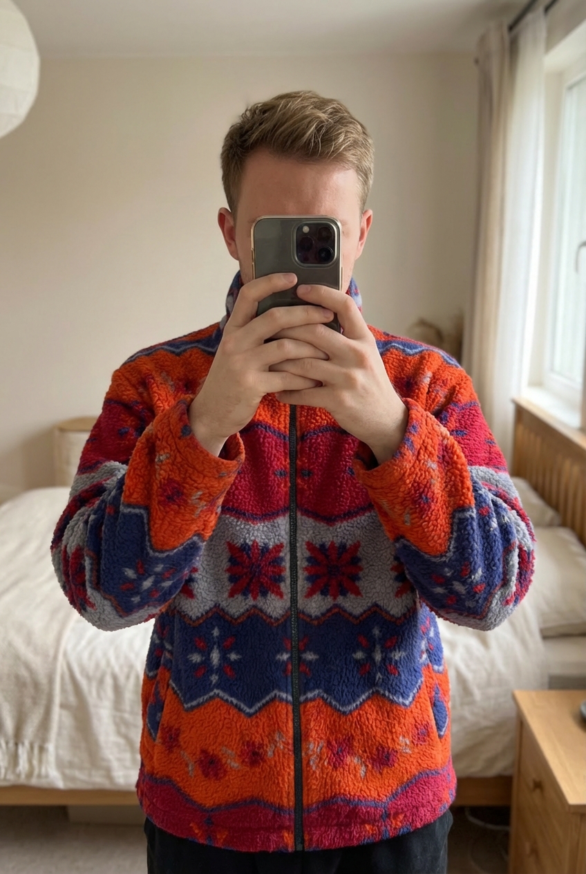 Une personne en Veste Polaire Sherpa Crazy Fleece Vintage Y2K Norway patern Rouge Orange L debout, face à la caméra, dans une chambre à la lumière douce, avec une lumière naturelle filtrant par la fenêtre.