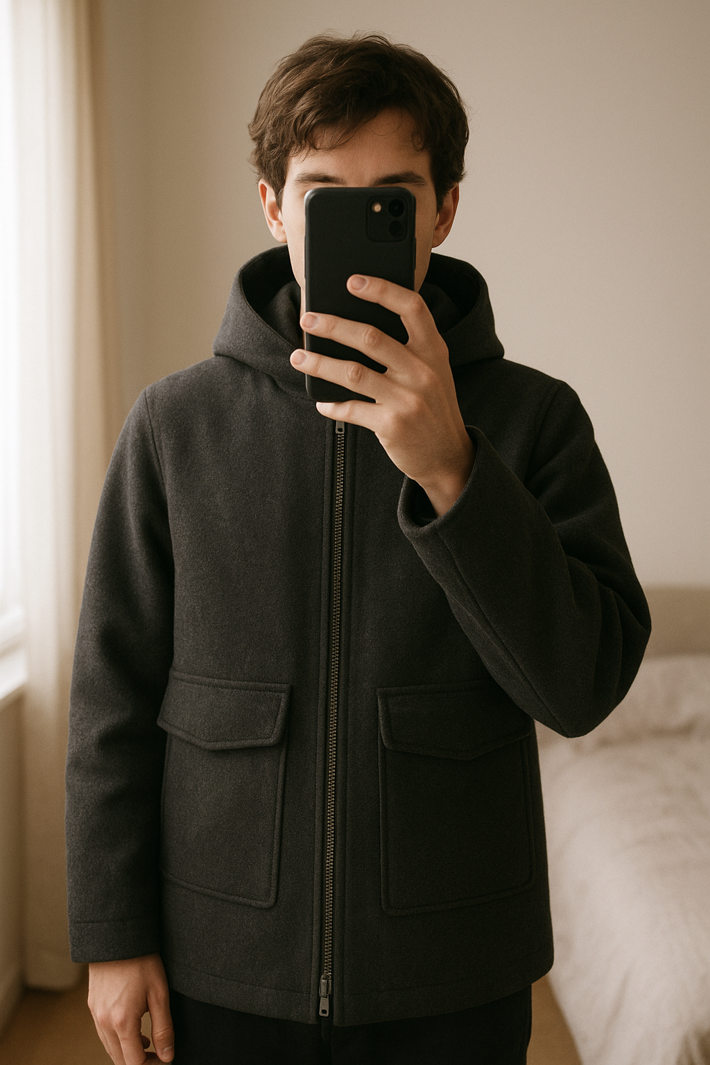 Veste Primark debout, face à la caméra, dans une chambre à la lumière douce, avec une lumière naturelle filtrant par la fenêtre.