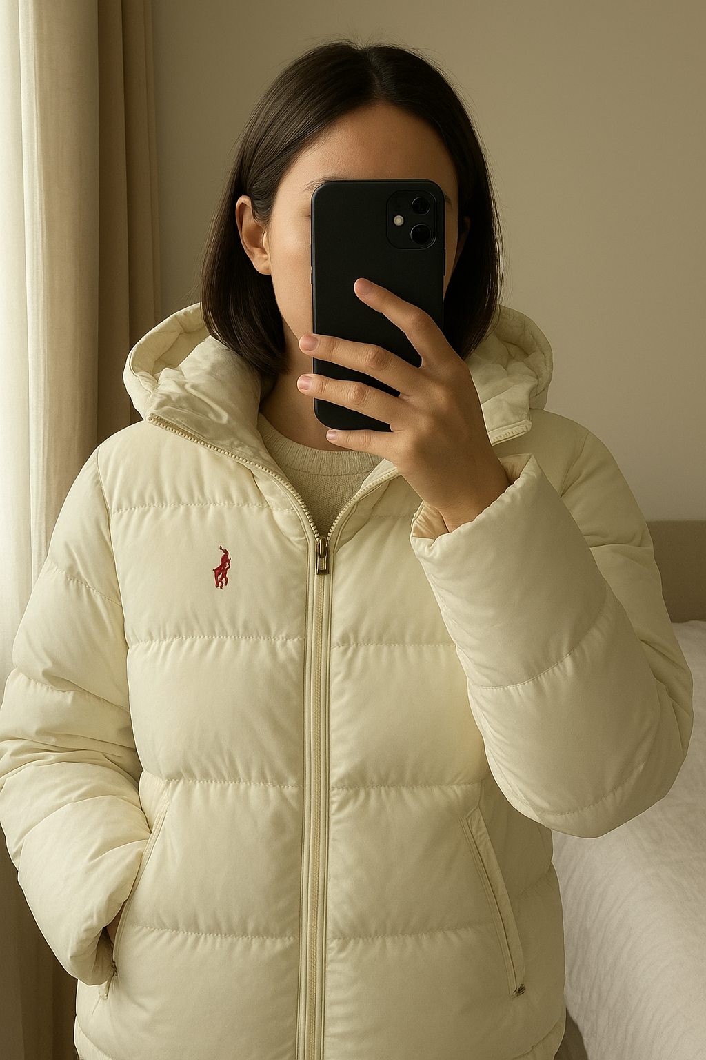 Veste Ralph Lauren debout, face à la caméra, dans une chambre à la lumière douce, avec une lumière naturelle filtrant par la fenêtre.