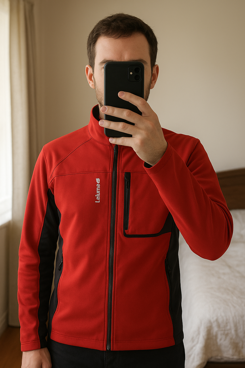 Veste randonnée Lafuma M softshell windactive rouge debout, face à la caméra, dans une chambre à la lumière douce, avec une lumière naturelle filtrant par la fenêtre.