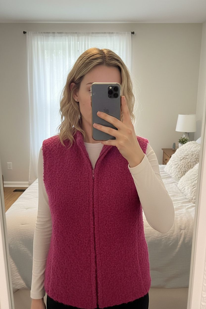 Veste sans manches rose debout, face à la caméra, dans une chambre à la lumière douce, avec une lumière naturelle filtrant par la fenêtre.
