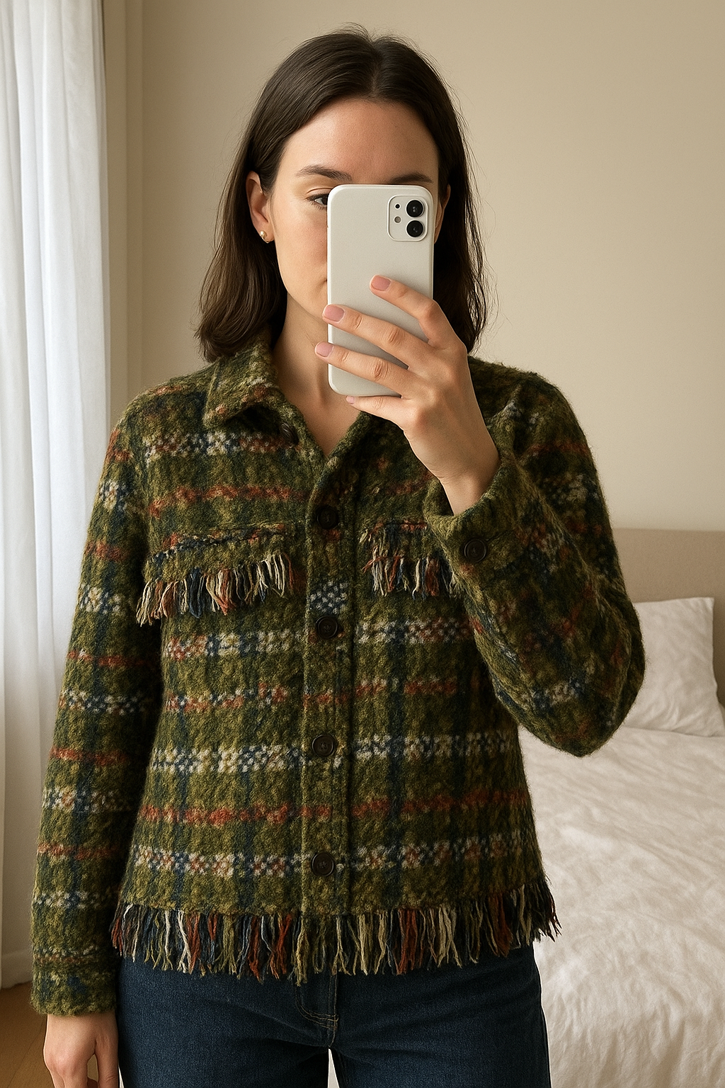 Veste Shirtaporter debout, face à la caméra, dans une chambre à la lumière douce, avec une lumière naturelle filtrant par la fenêtre.