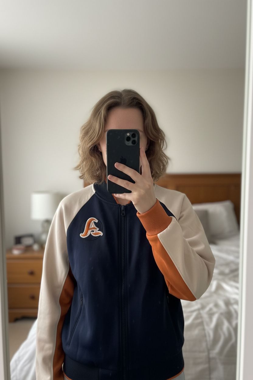 Une personne en Veste style bombers debout, face à la caméra, dans une chambre à la lumière douce, avec une lumière naturelle filtrant par la fenêtre.