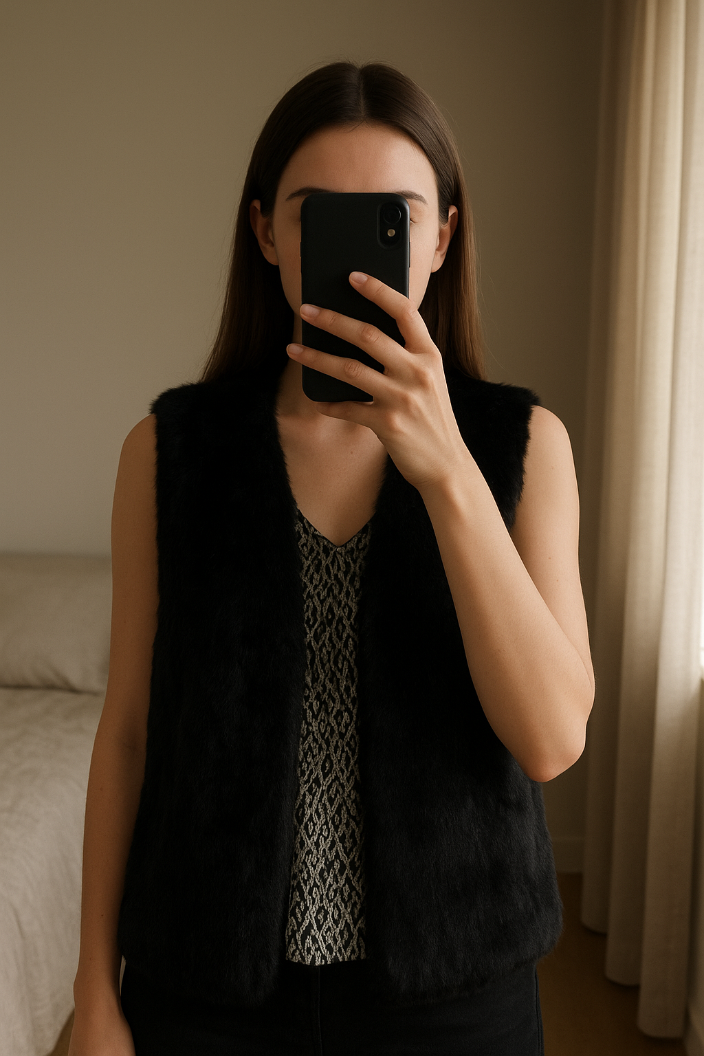 veste Suncoo sans manche en fourrure debout, face à la caméra, dans une chambre à la lumière douce, avec une lumière naturelle filtrant par la fenêtre.