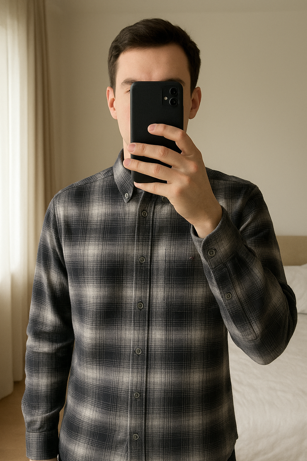 Une personne en Veste tommy debout, face à la caméra, dans une chambre à la lumière douce, avec une lumière naturelle filtrant par la fenêtre.