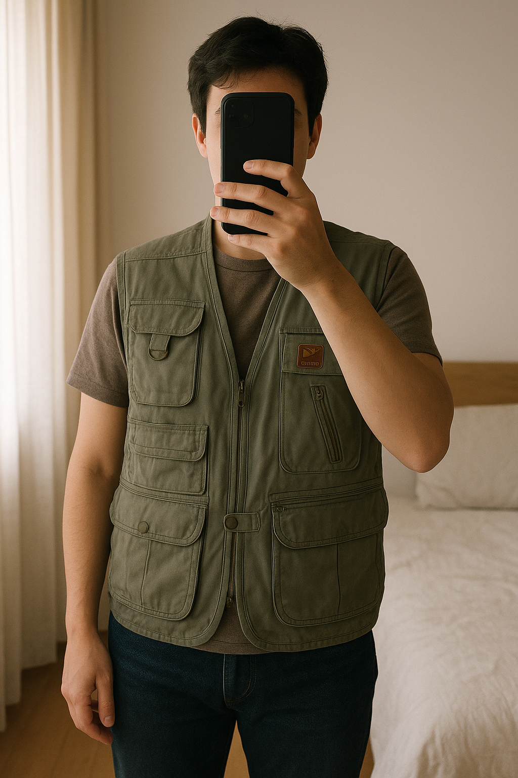 Veste utilitaire vintage Imperex – Taille M debout, face à la caméra, dans une chambre à la lumière douce, avec une lumière naturelle filtrant par la fenêtre.