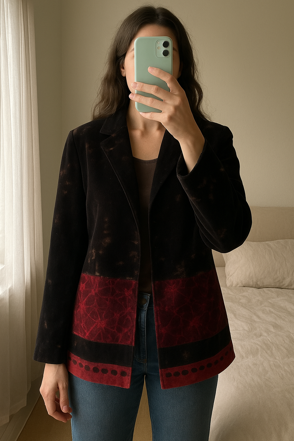 Veste velours neuve Liu Jo debout, face à la caméra, dans une chambre à la lumière douce, avec une lumière naturelle filtrant par la fenêtre.