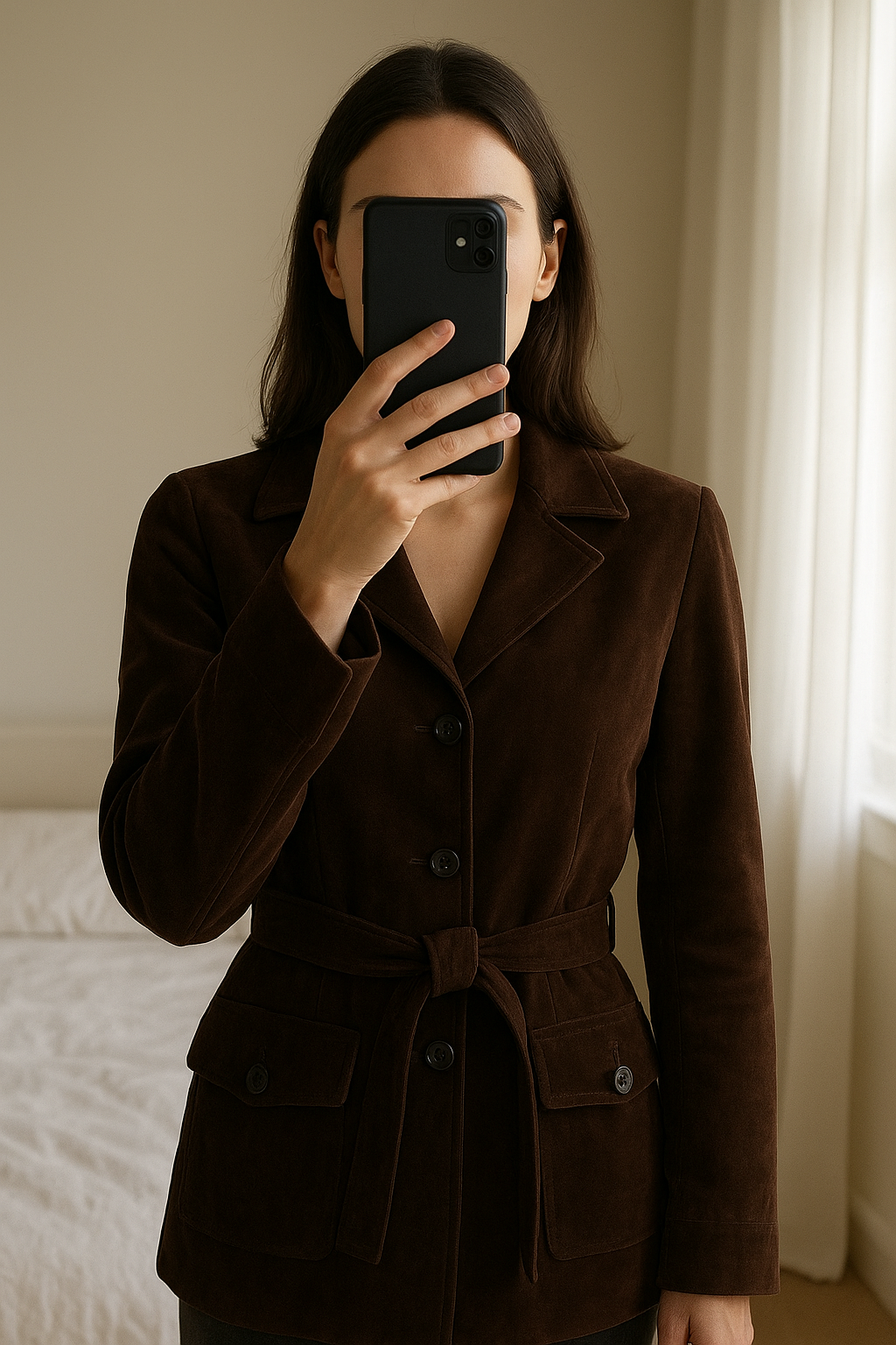 Veste vintage style saharienne Ceinturée en suedine 3 Boutons debout, face à la caméra, dans une chambre à la lumière douce, avec une lumière naturelle filtrant par la fenêtre.
