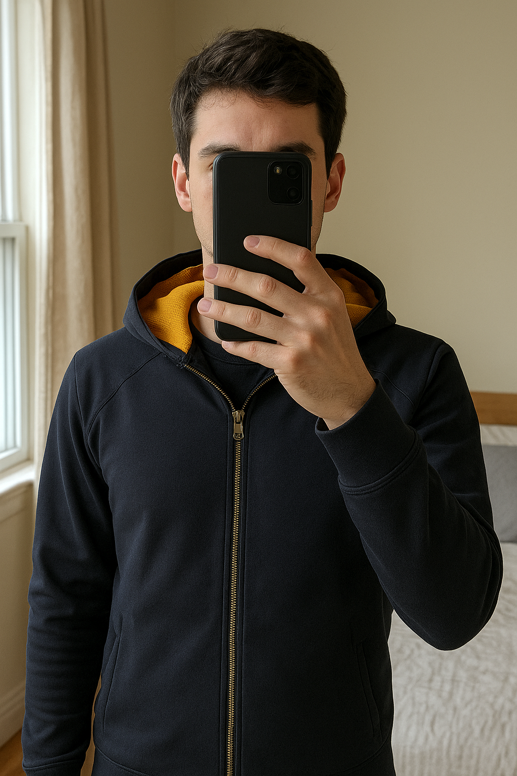 Veste Zara zippée debout, face à la caméra, dans une chambre à la lumière douce, avec une lumière naturelle filtrant par la fenêtre.