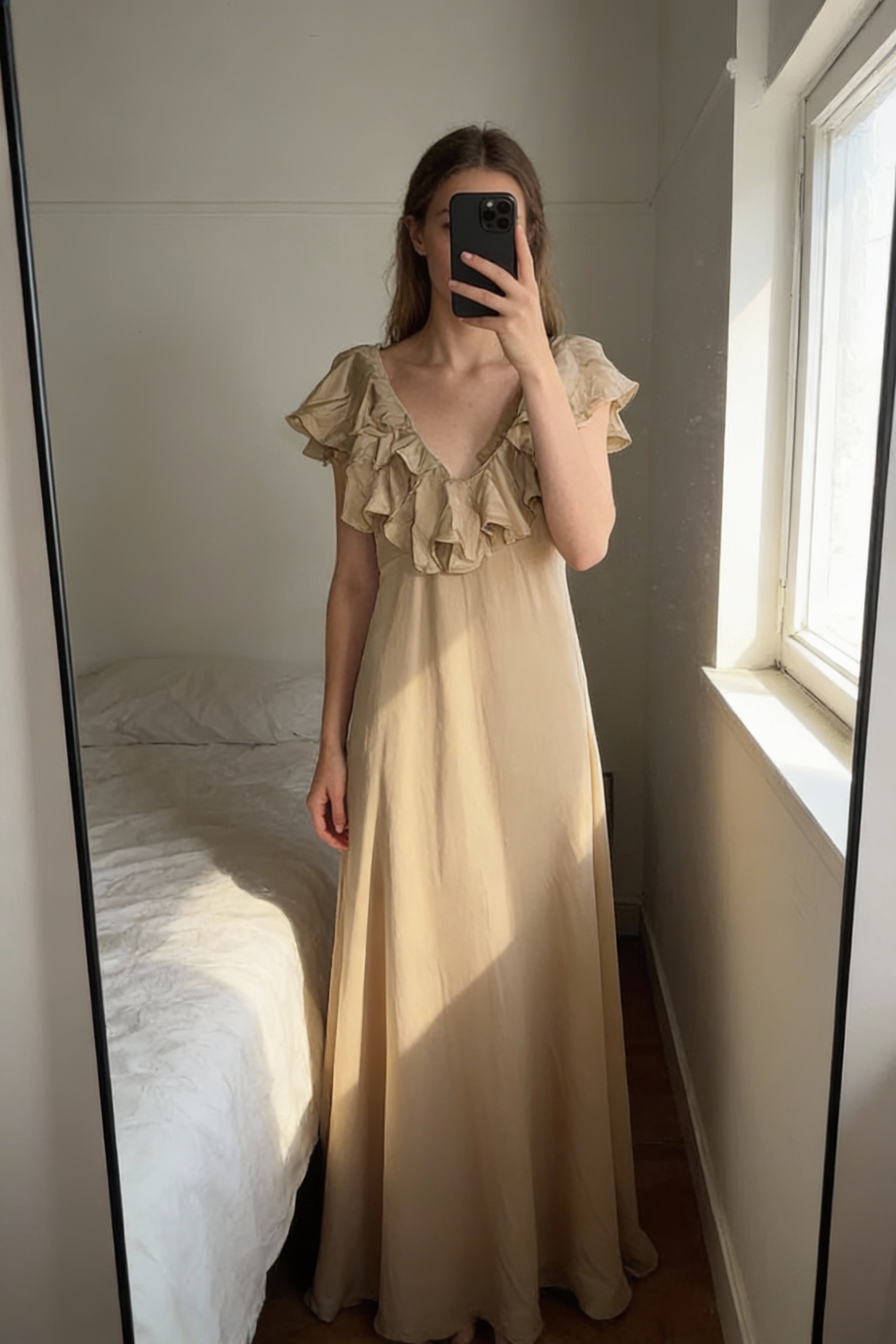 Vintage Beige Ruffle Maxi Dress- Elegant & Timeless standing straight facing the camera, in a softly lit bedroom setting, with gentle natural light filtering through a window.