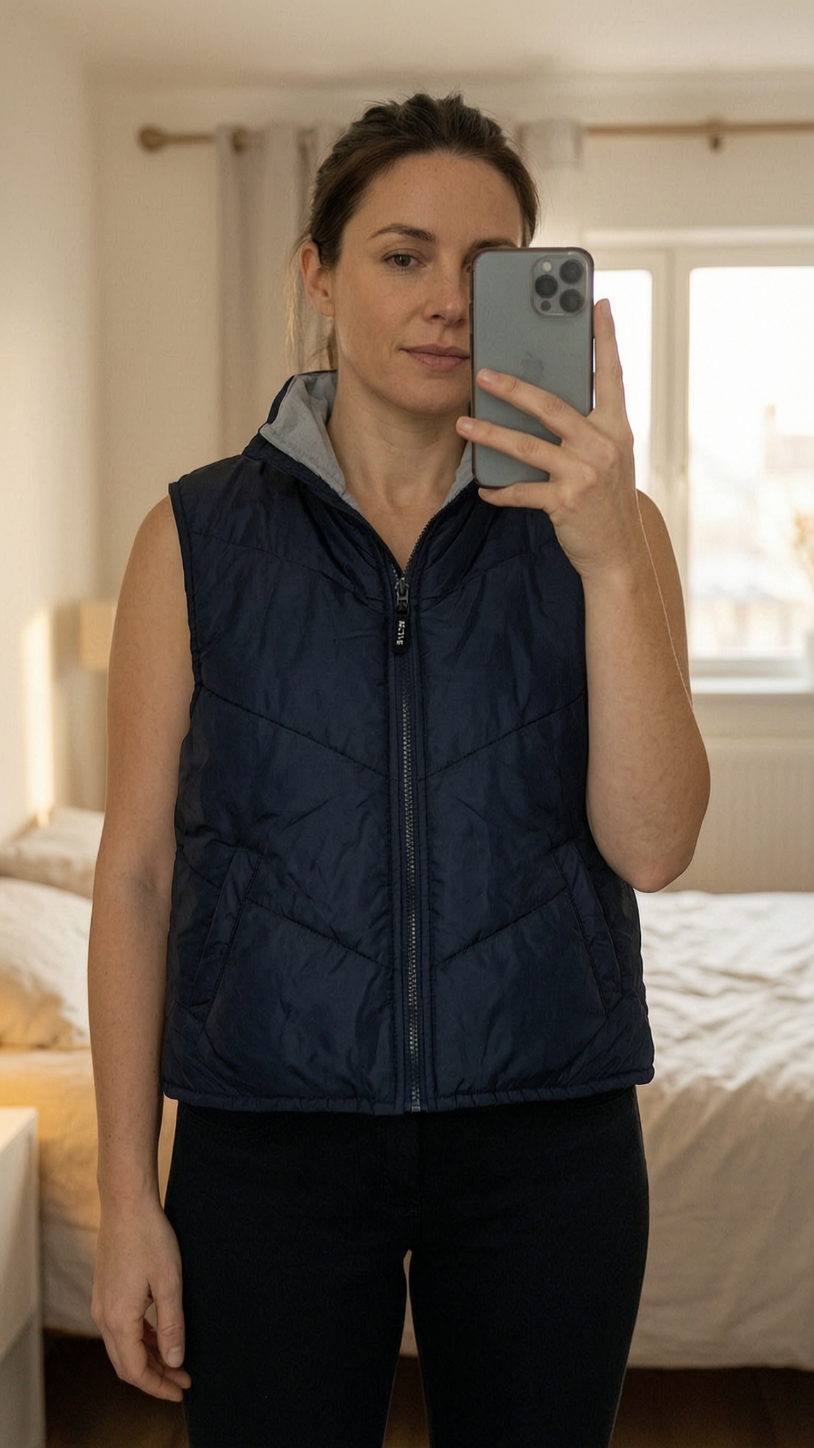 Vintage Black Reversible Puffer Gilet / Sleeveless Bodywarmer – Size XS standing straight facing the camera, in a softly lit bedroom setting, with gentle natural light filtering through a window.