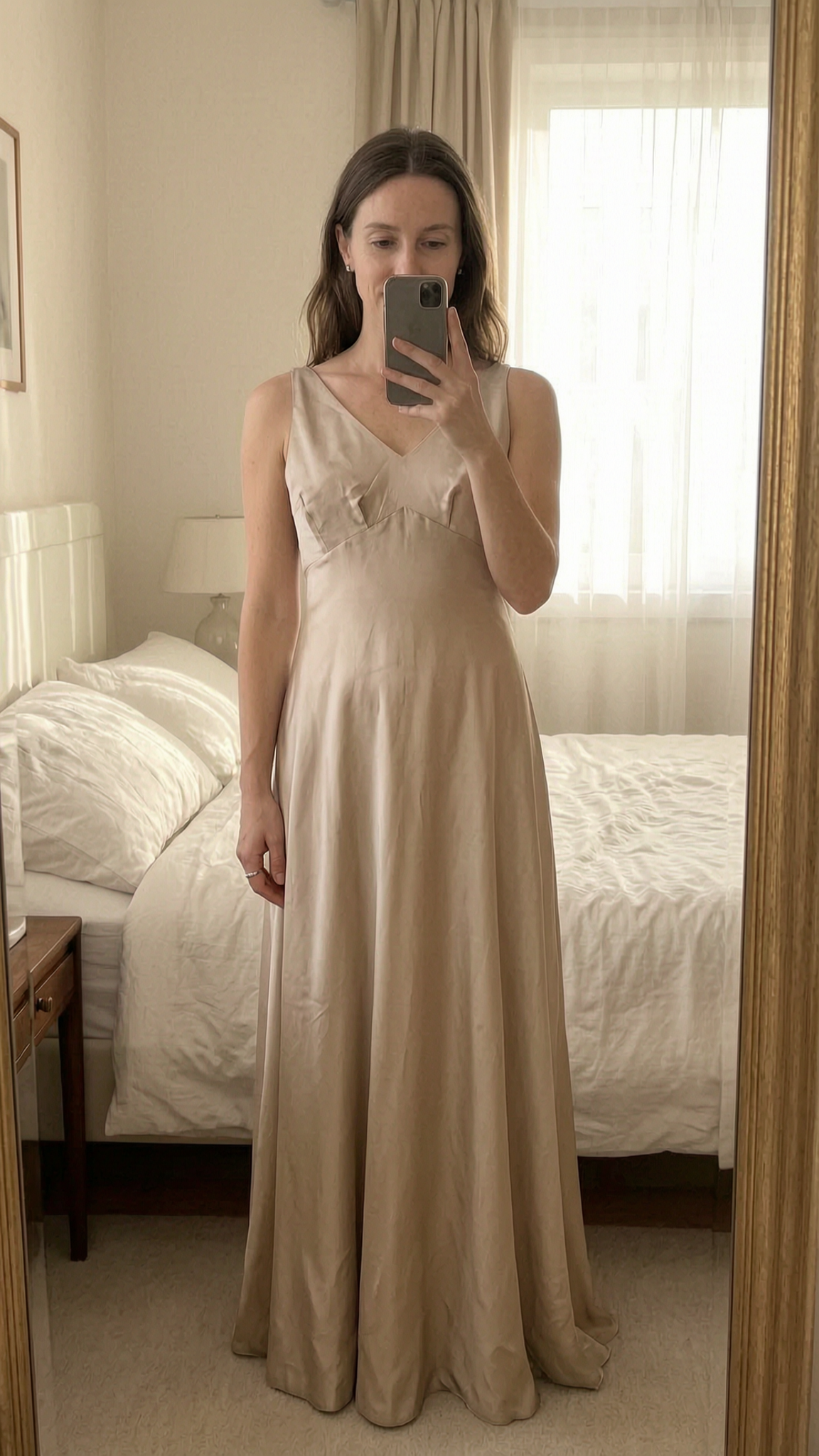💛Vintage Champagne/Gold Satin Maxi Dress- Immaculate Condition standing straight facing the camera, in a softly lit bedroom setting, with gentle natural light filtering through a window.