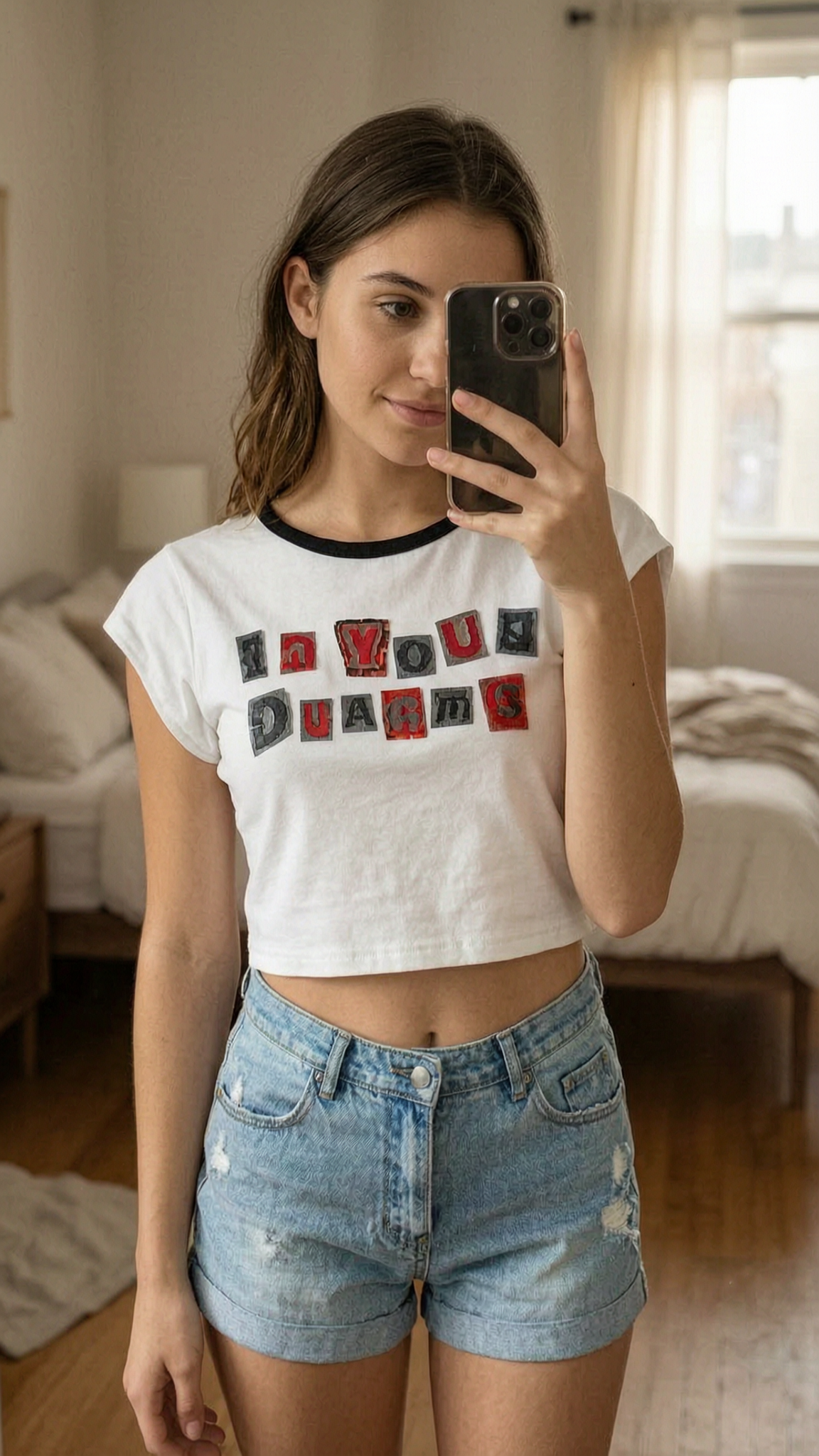 A person in Vintage H&M In Your Dreams Baby Tee M Y2K Graphic Crop Top Indie Sleaze standing straight facing the camera, with a slim body type, in a softly lit bedroom setting, with gentle natural light filtering through a window.