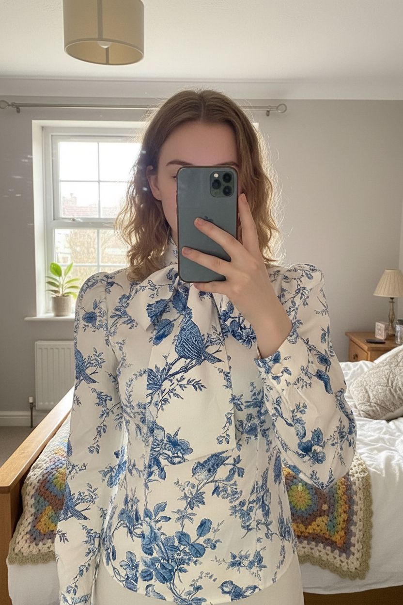 Vintage-Inspired Botanical Bliss Blouse - Size 6 standing straight facing the camera, in a softly lit bedroom setting, with gentle natural light filtering through a window.