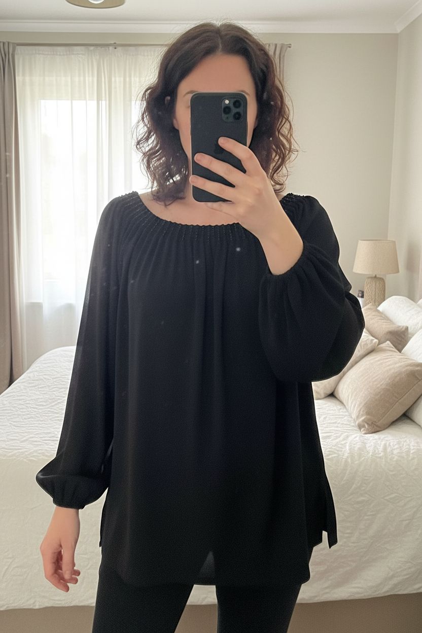 Vintage Jacques Vert Black Beaded Neckline Blouse Size L - off or on shoulder standing straight facing the camera, in a softly lit bedroom setting, with gentle natural light filtering through a window.