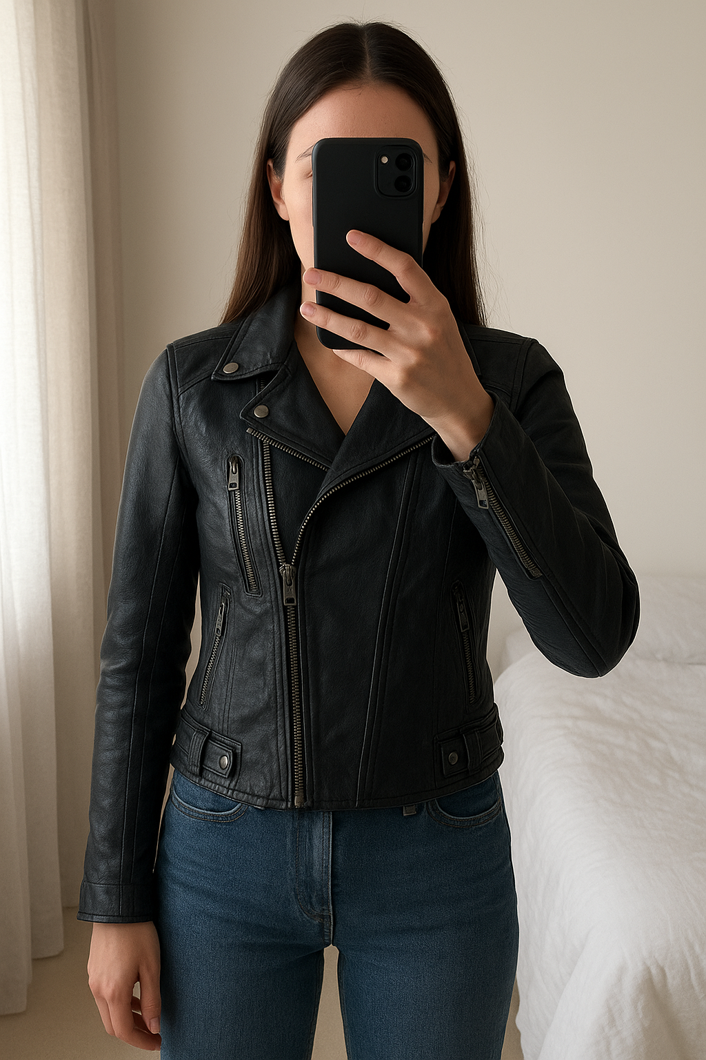 Vintage Leather Biker Jacket X Small Women's standing straight facing the camera, in a softly lit bedroom setting, with gentle natural light filtering through a window.