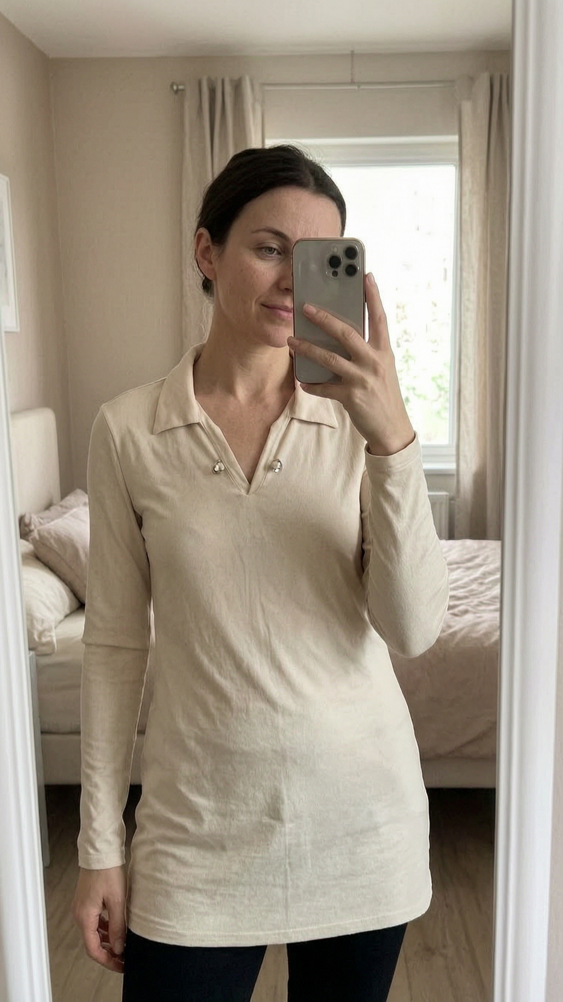 Vintage LOOK Fashion Cream Long Sleeve Collared Top Size UK 10 standing straight facing the camera, in a softly lit bedroom setting, with gentle natural light filtering through a window.