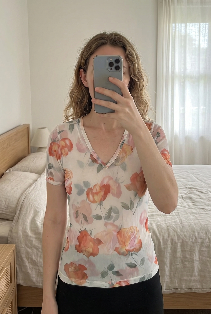 Vintage Miss Selfridge Sheer Floral Mesh Top – Size UK 8 – V-Neck – Y2K Style standing straight facing the camera, in a softly lit bedroom setting, with gentle natural light filtering through a window.