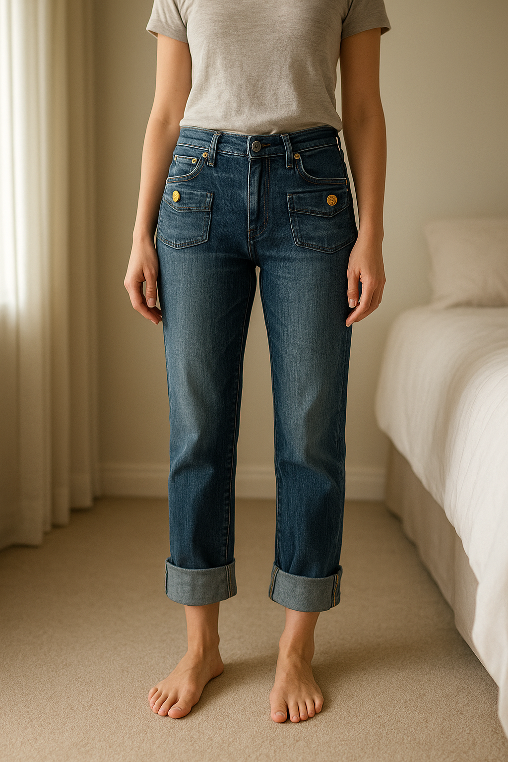 Vintage Miss Sixty Jeans Jim standing straight facing the camera, in a softly lit bedroom setting, with gentle natural light filtering through a window.
