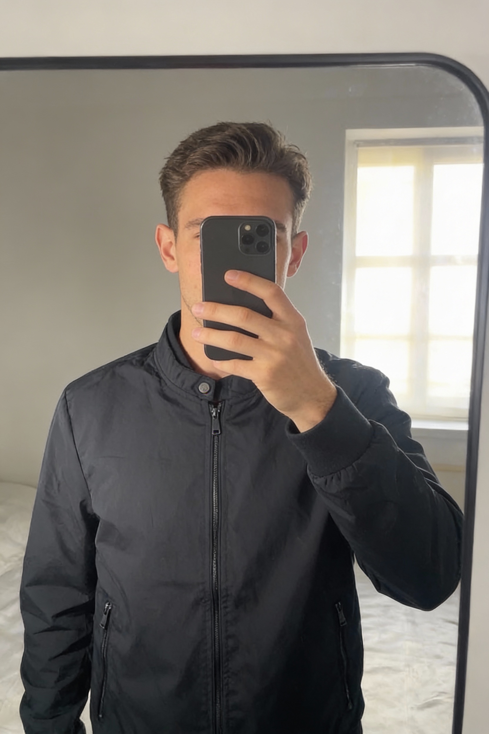 💙Vintage Navy Bomber Jacket – Classic Minimal Style (Size M) 💙 standing straight facing the camera, in a softly lit bedroom setting, with gentle natural light filtering through a window.