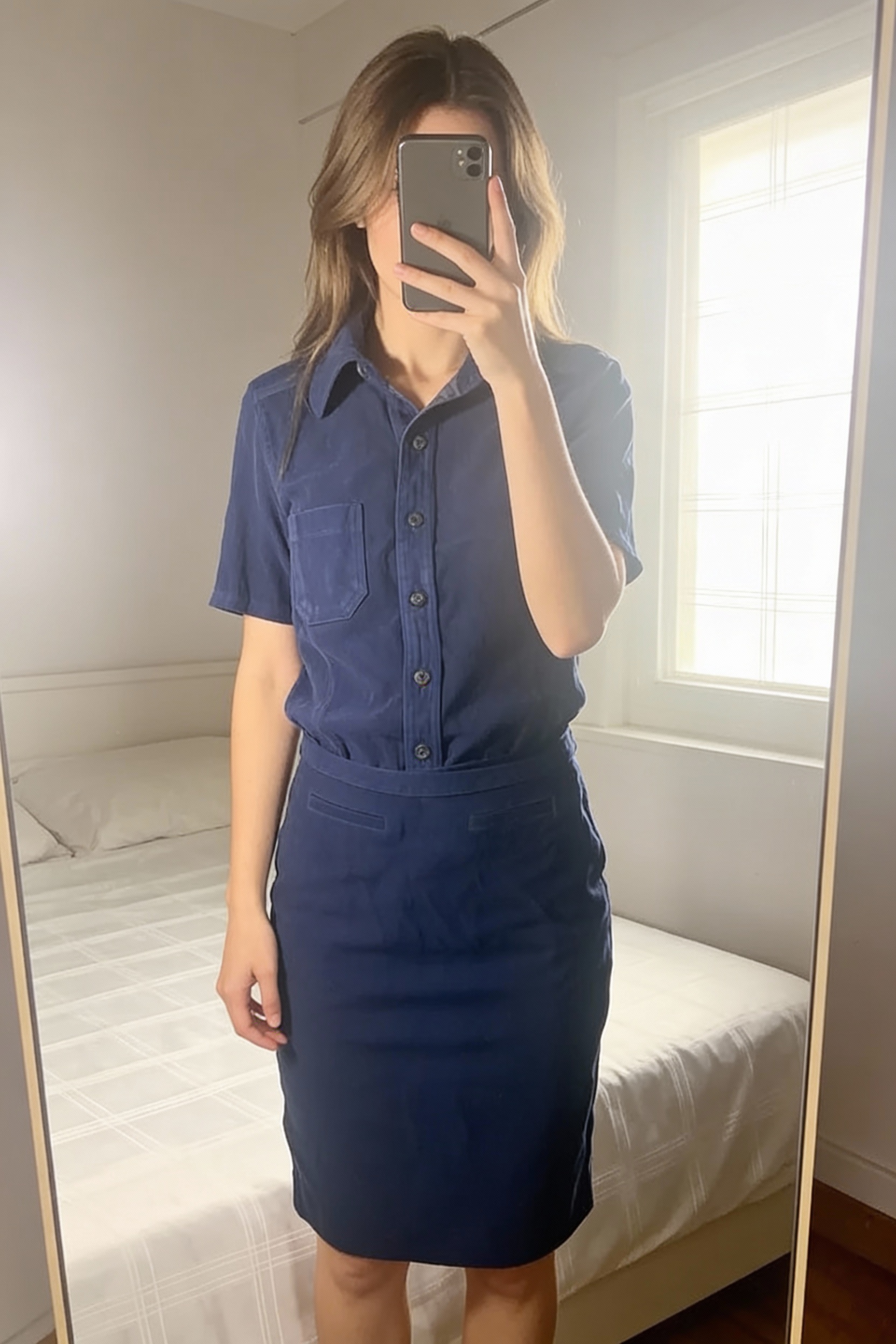 Vintage Navy Suede Co Ord Shirt and Tailored Pencil Skirt with Slit Size 6/8 standing straight facing the camera, in a softly lit bedroom setting, with gentle natural light filtering through a window.