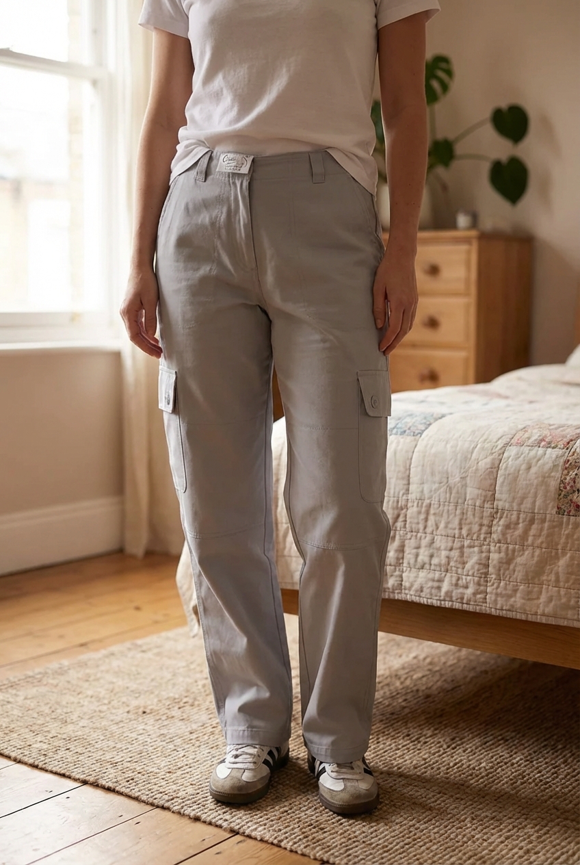 Vintage Petite Light Grey Cargo Trousers Wide Leg standing straight facing the camera, in a softly lit bedroom setting, with gentle natural light filtering through a window.