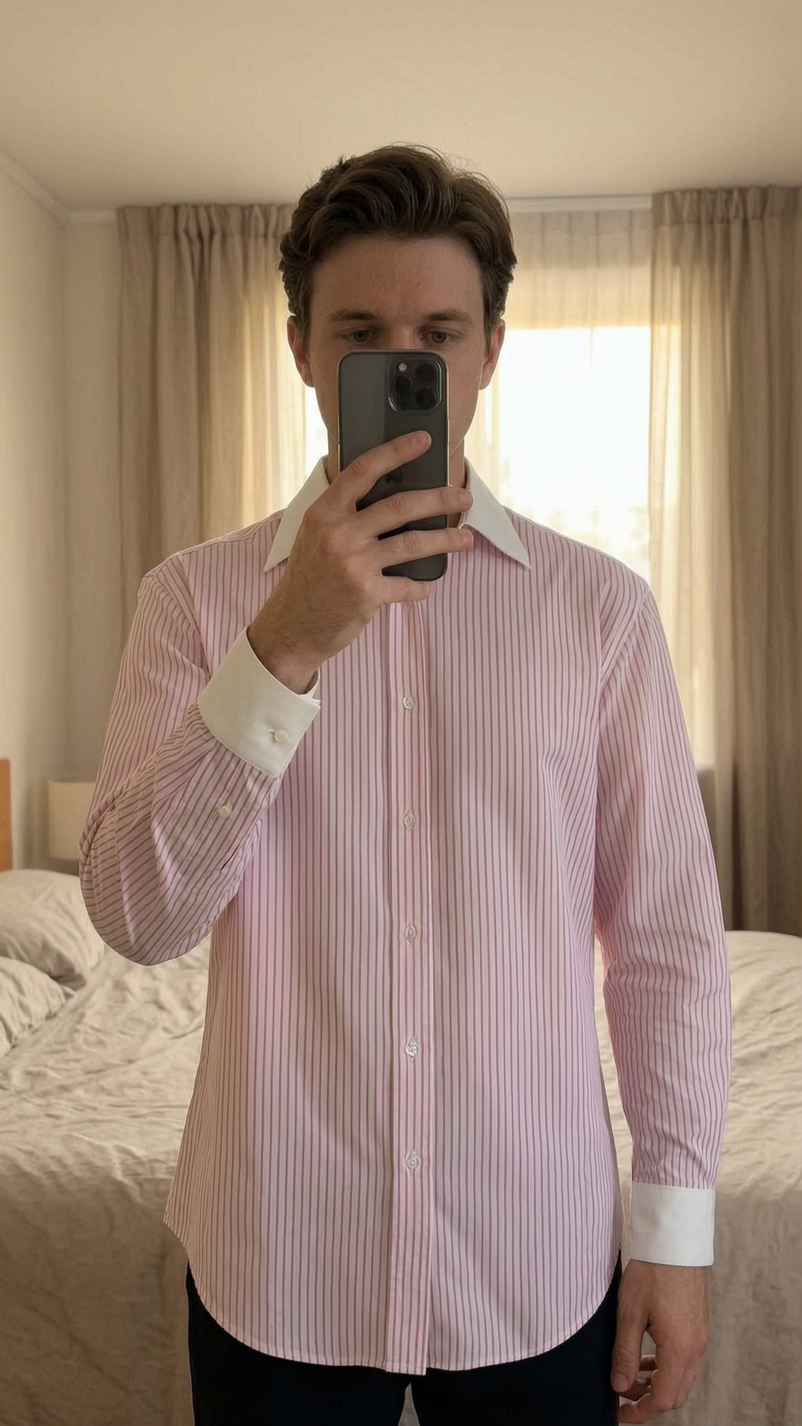 Vintage Pink Striped Shirt (XL) - RRP: £150 standing straight facing the camera, in a softly lit bedroom setting, with gentle natural light filtering through a window.