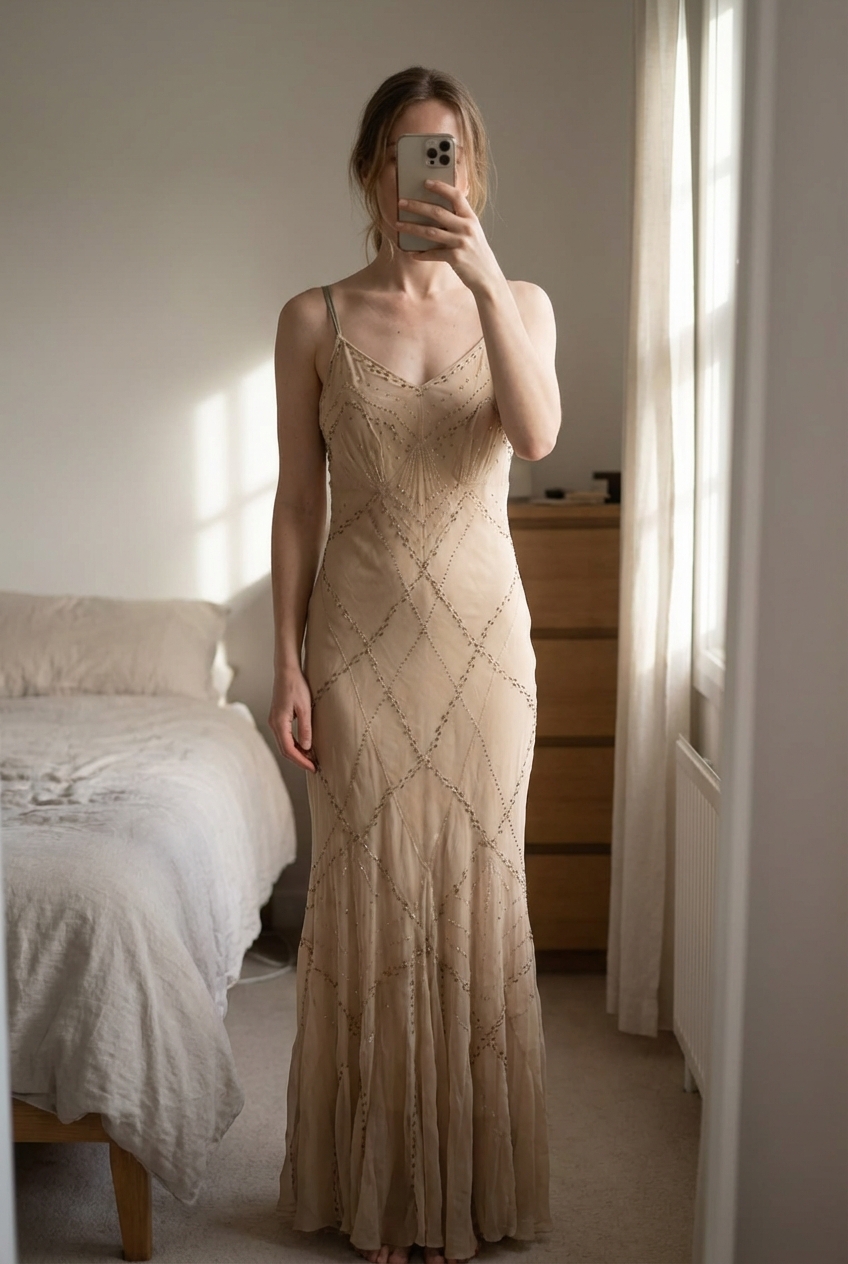 Vintage Platinum 100% Silk Nude / Champagne Beaded Maxi Dress Elegant Formal Dress Size UK 14 standing straight facing the camera, in a softly lit bedroom setting, with gentle natural light filtering through a window.