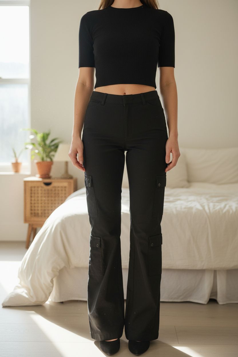 Vintage Sasperilla London Black Flared Cargo Trousers- Size 8 standing straight facing the camera, in a softly lit bedroom setting, with gentle natural light filtering through a window.