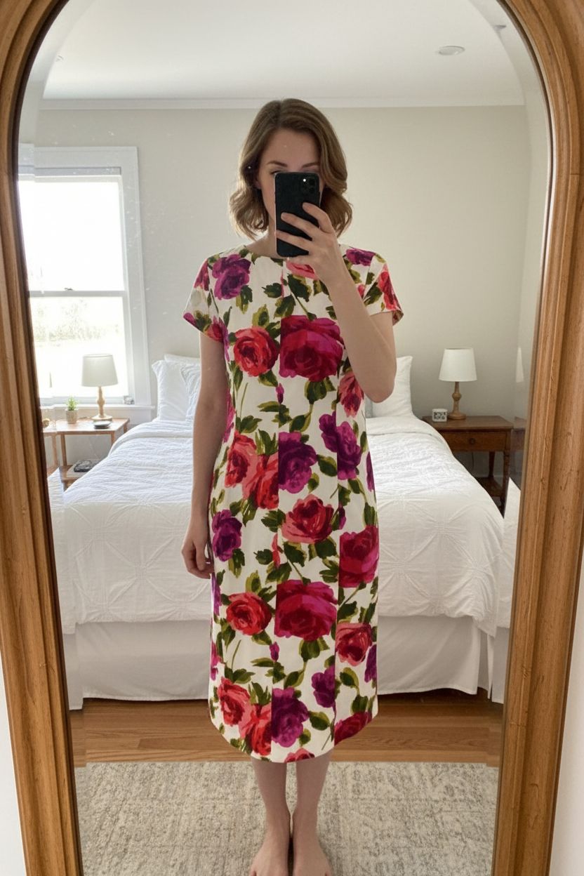 Vintage Style Floral Shift Dress Cotton Blend Midi Bold Roses UK L standing straight facing the camera, in a softly lit bedroom setting, with gentle natural light filtering through a window.