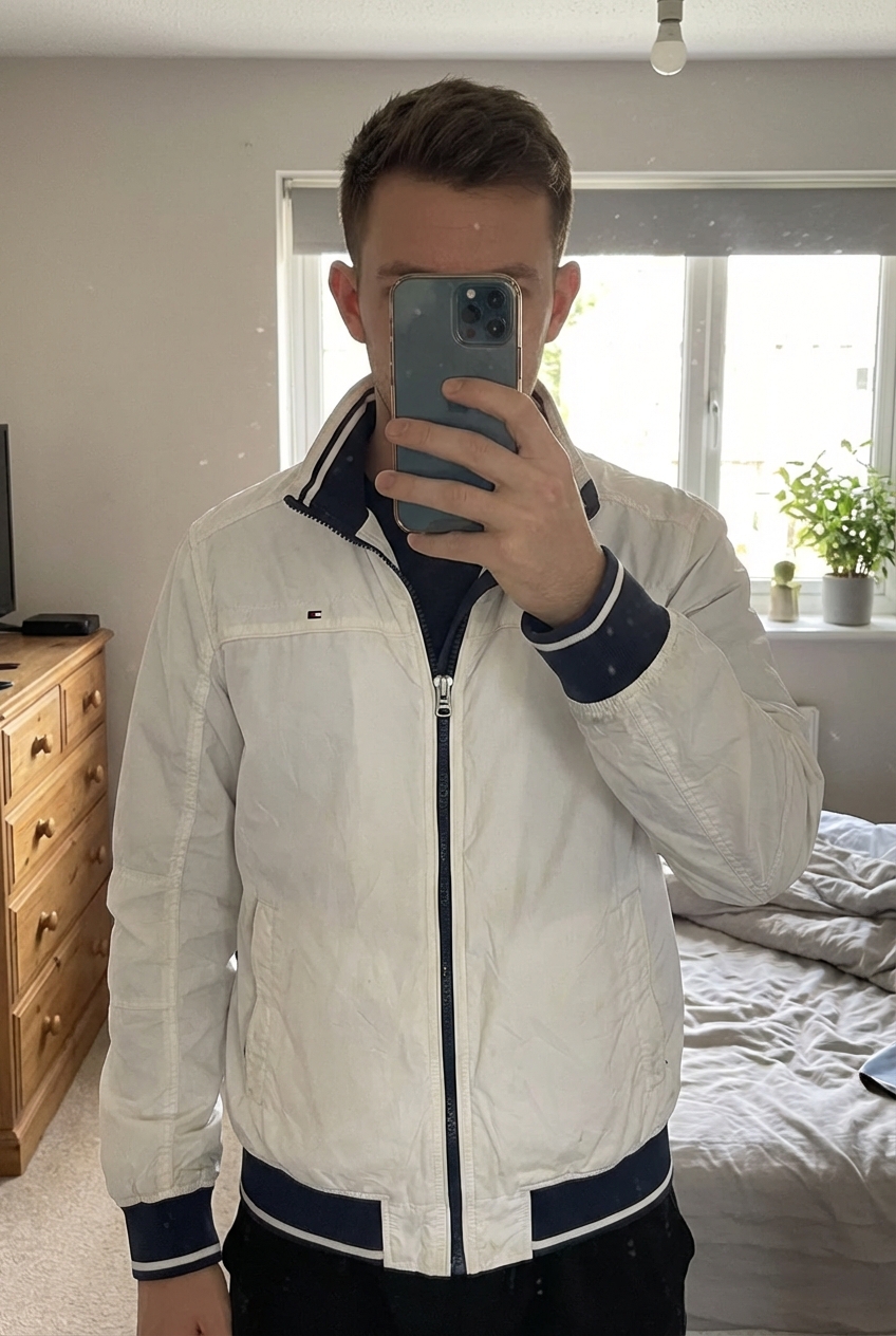 🤍 Vintage Tommy Hilfiger Men’s Lightweight Spring/Summer Zip Jacket – White/Navy – Size XXL standing straight facing the camera, in a softly lit bedroom setting, with gentle natural light filtering through a window.
