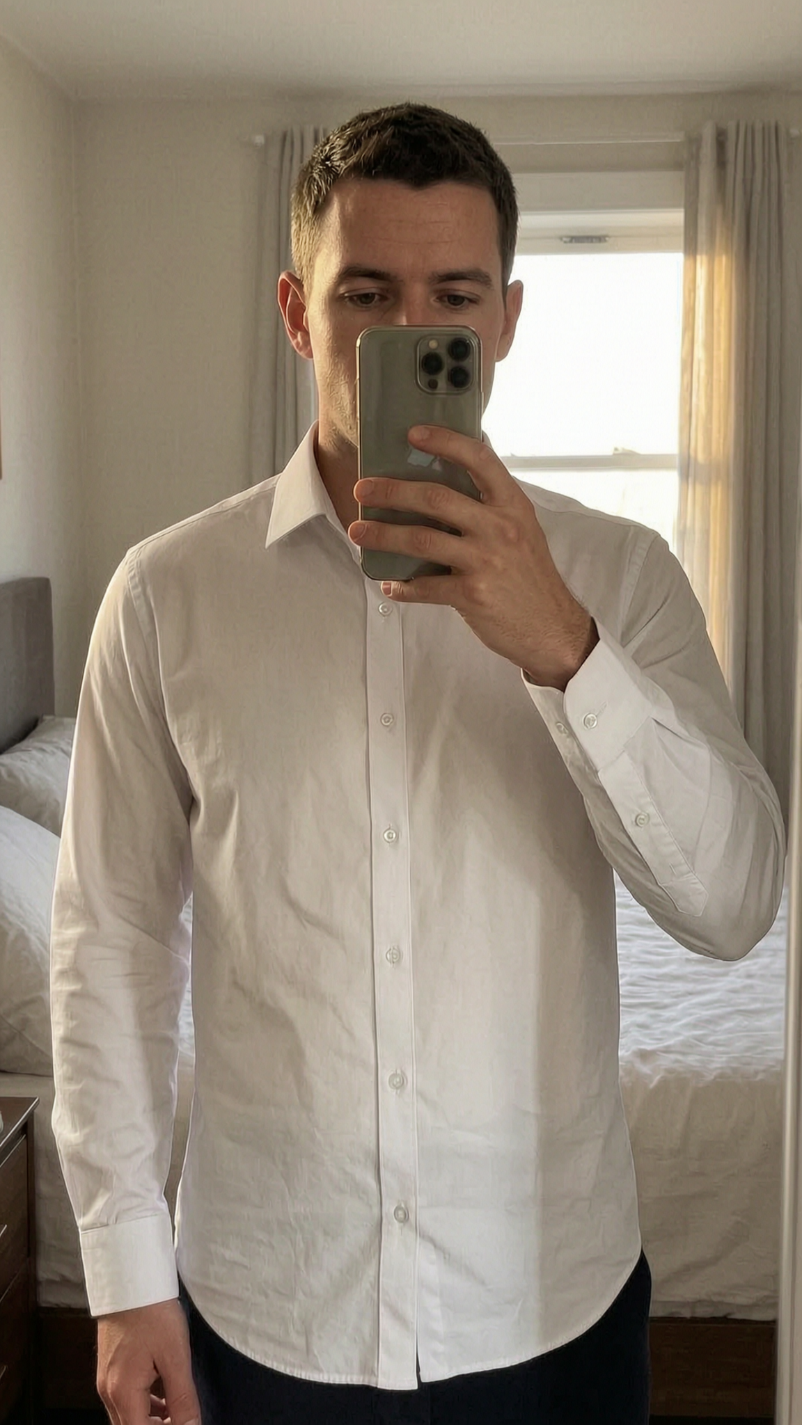 Vintage White Dress Shirt (XL) standing straight facing the camera, in a softly lit bedroom setting, with gentle natural light filtering through a window.