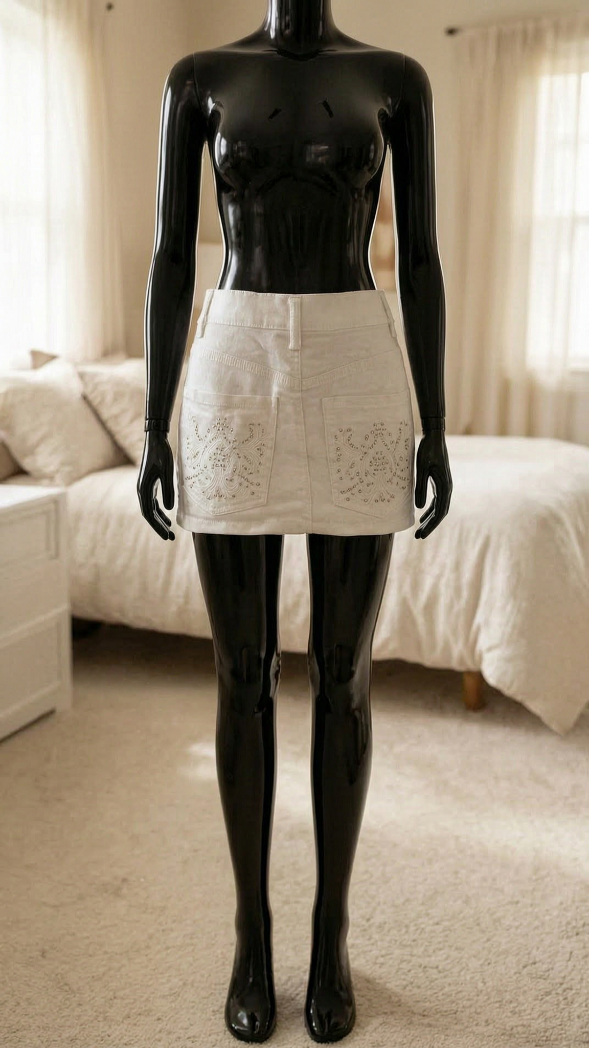 a glossy black plastic mannequin with no facial features in Vintage White Embellished Skirt – Size 8 standing straight facing the camera, with a slim body type, in a softly lit bedroom setting, with gentle natural light filtering through a window.