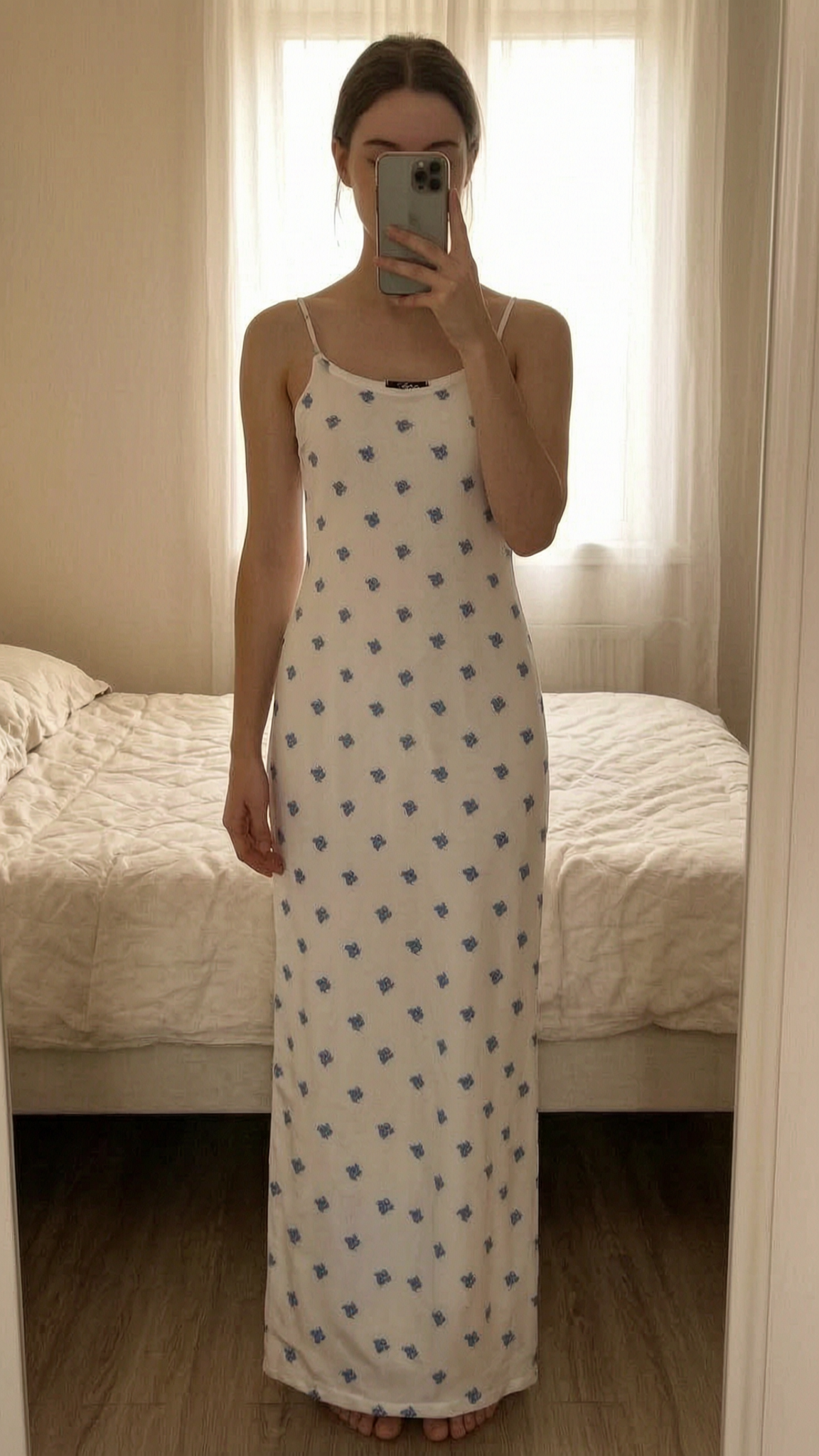 Vintage Y2K An’ge White & Blue Embroidered Rose Maxi Dress Coquette Fairycore Size XS standing straight facing the camera, in a softly lit bedroom setting, with gentle natural light filtering through a window.