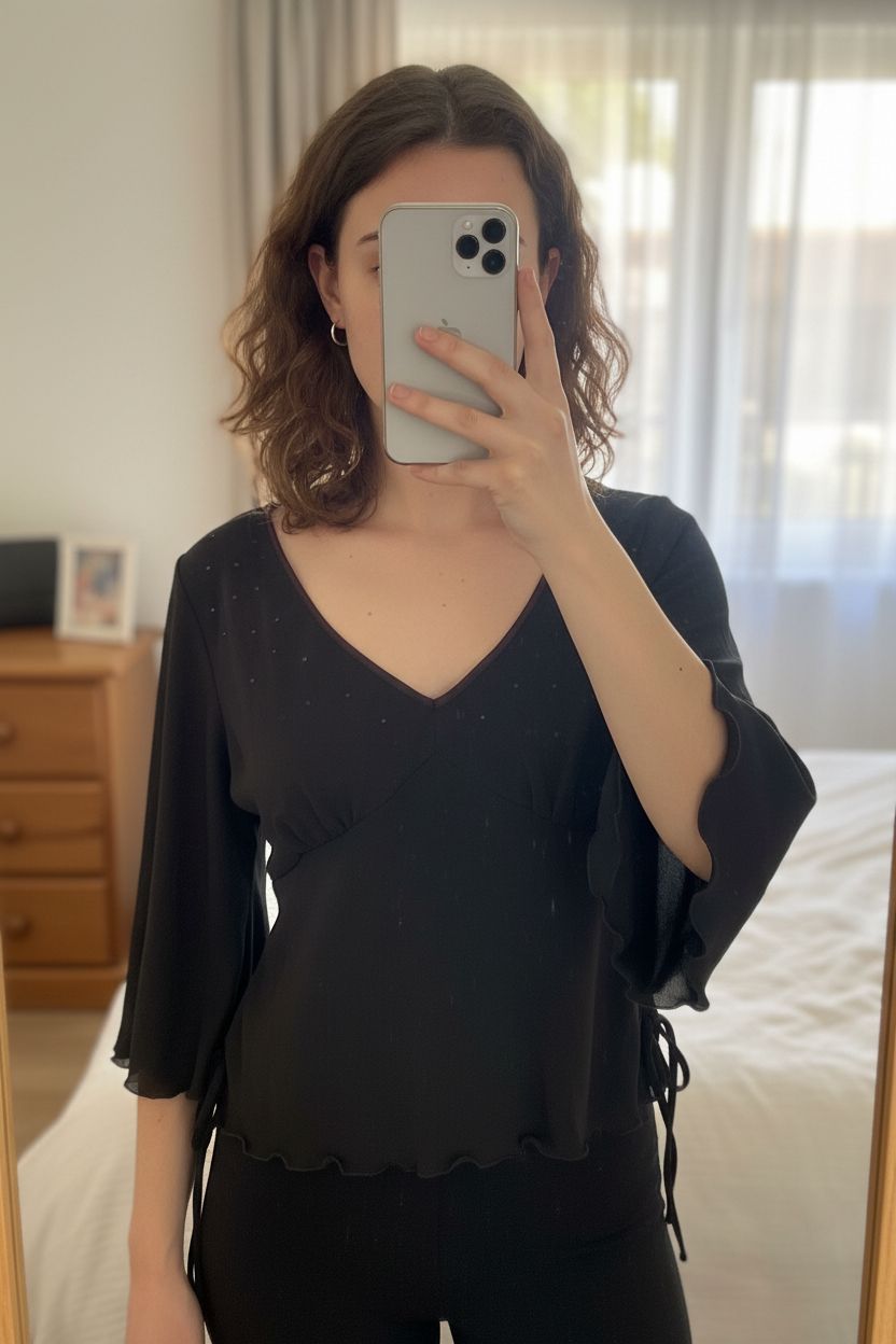 A person in Vintage Y2K Anna Brooks floaty diamond embellished black 3/4 sleeve top standing straight facing the camera, in a softly lit bedroom setting, with gentle natural light filtering through a window.