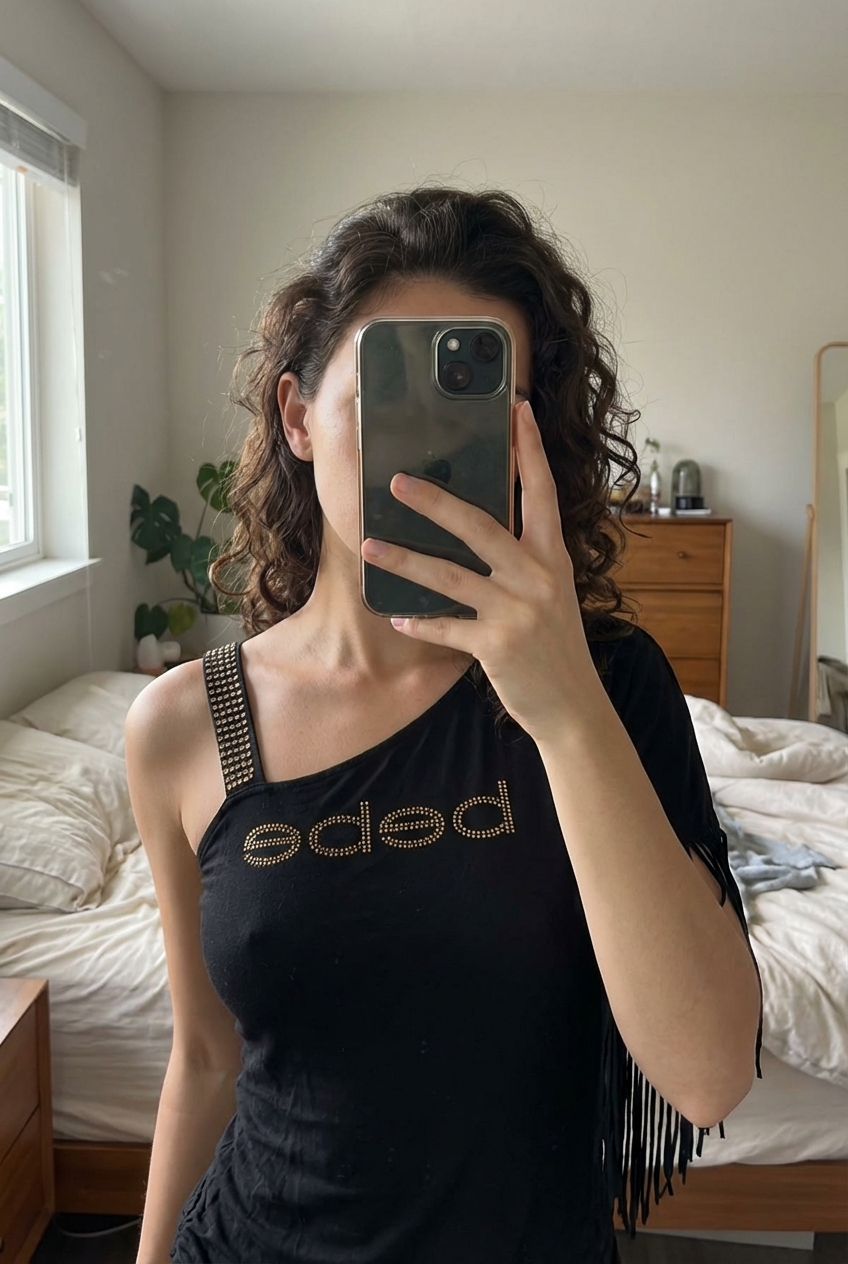 A person in Vintage Y2K bebe black rhinestone diamond detail T-shirt open shoulder standing straight facing the camera, in a softly lit bedroom setting, with gentle natural light filtering through a window.