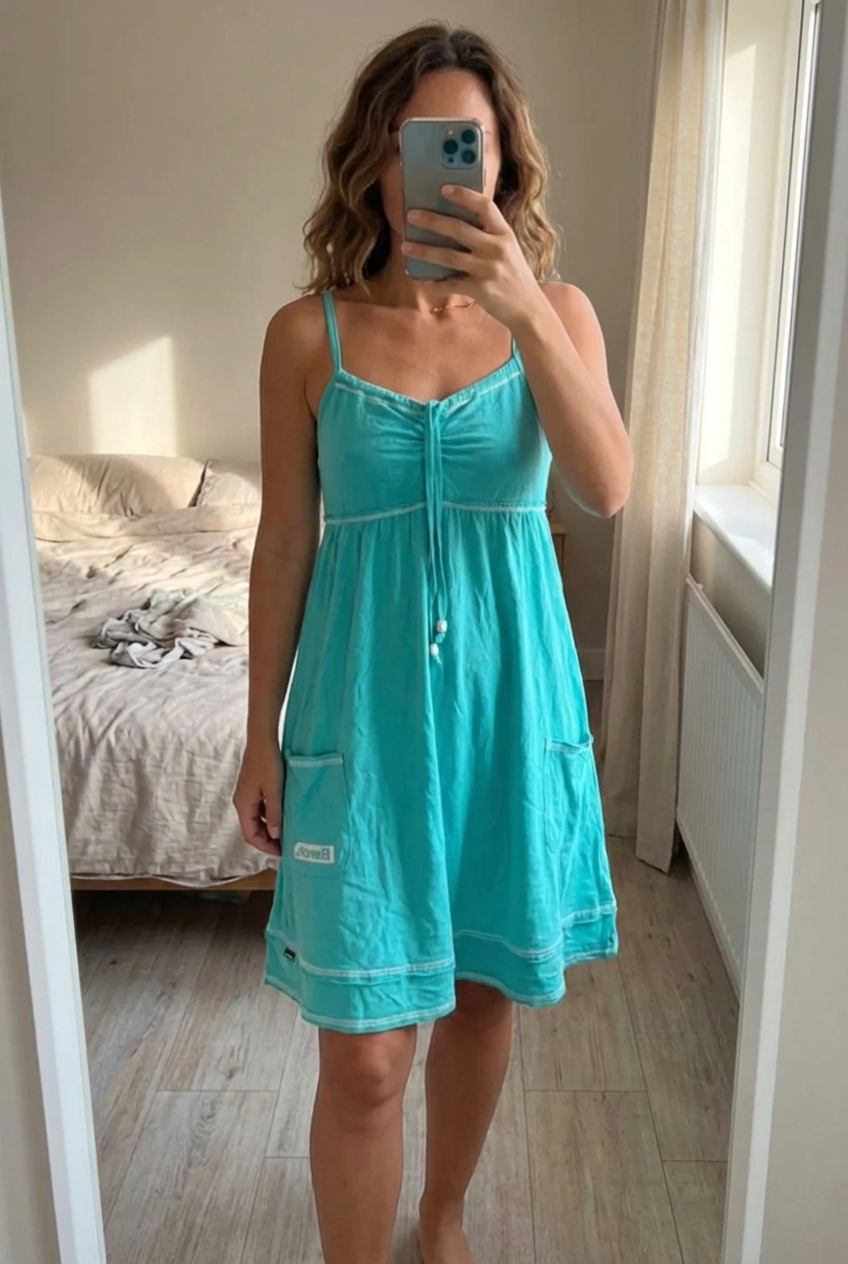 A person in Vintage Y2K bench blue floaty mini dress standing straight facing the camera, in a softly lit bedroom setting, with gentle natural light filtering through a window.