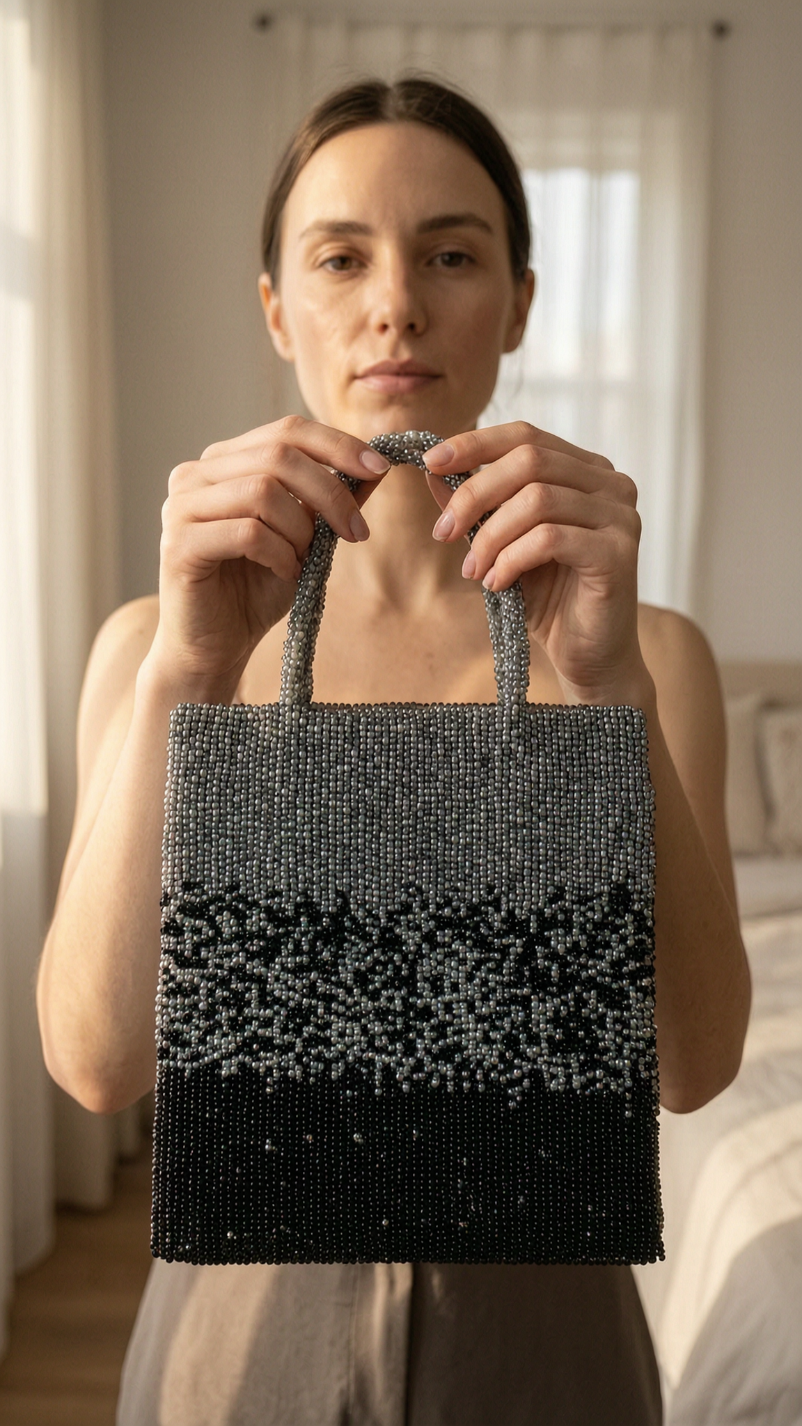 vintage y2k black beaded handbag evening party bag standing straight facing the camera, in a softly lit bedroom setting, with gentle natural light filtering through a window.
