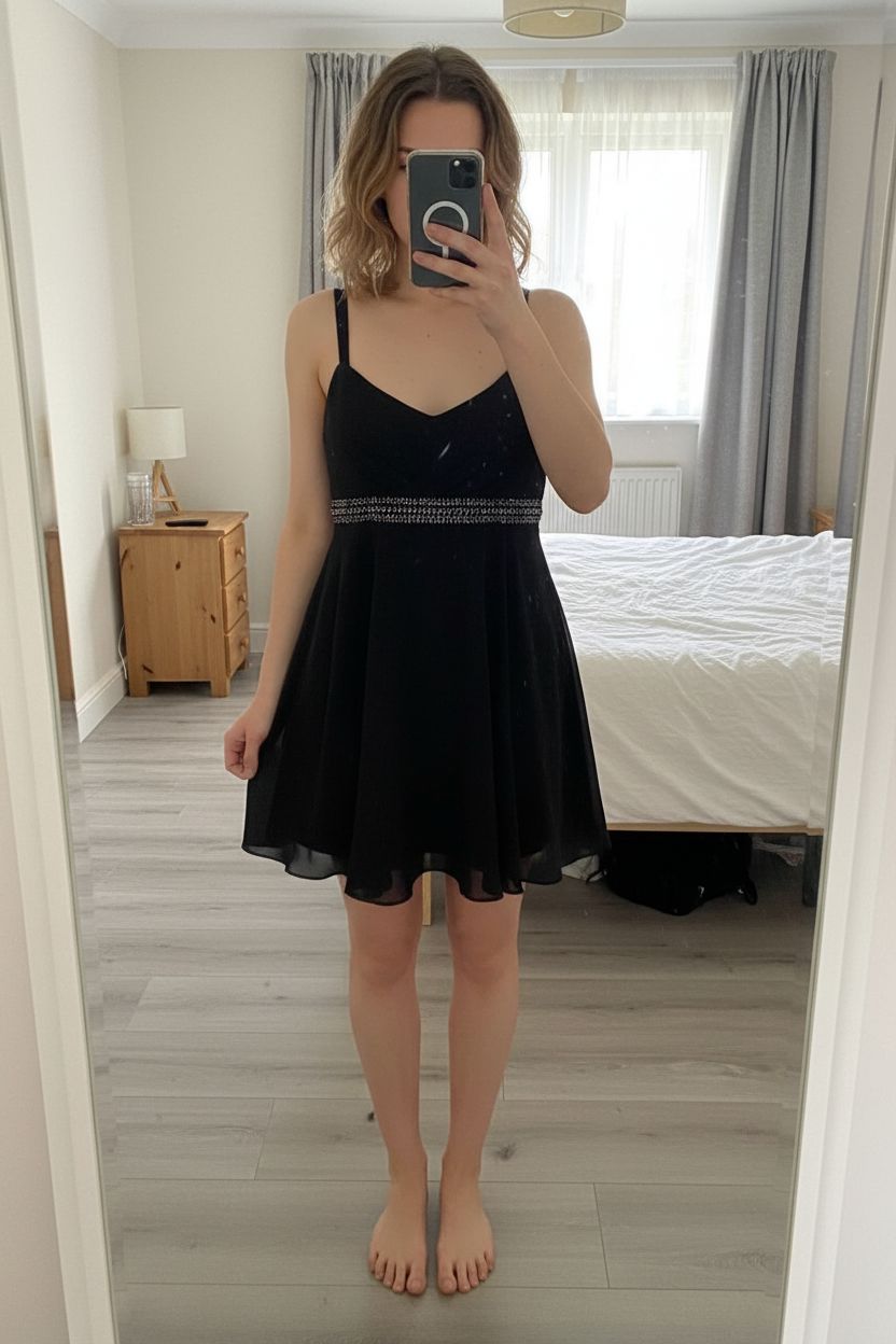 A person in Vintage Y2K black floaty jasper conran mini dress standing straight facing the camera, in a softly lit bedroom setting, with gentle natural light filtering through a window.