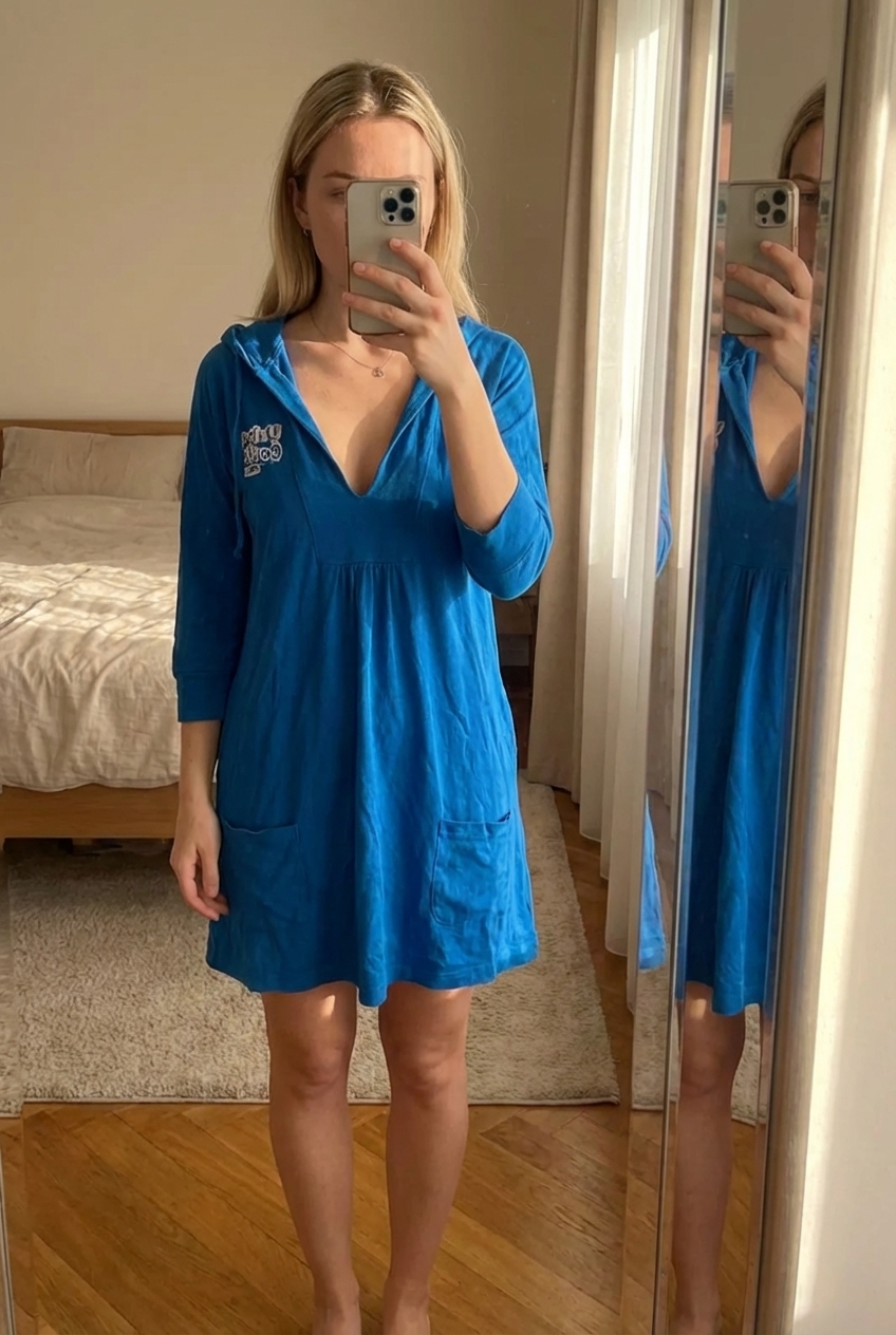 Vintage Y2K blue hoodie jumper dress standing straight facing the camera, in a softly lit bedroom setting, with gentle natural light filtering through a window.