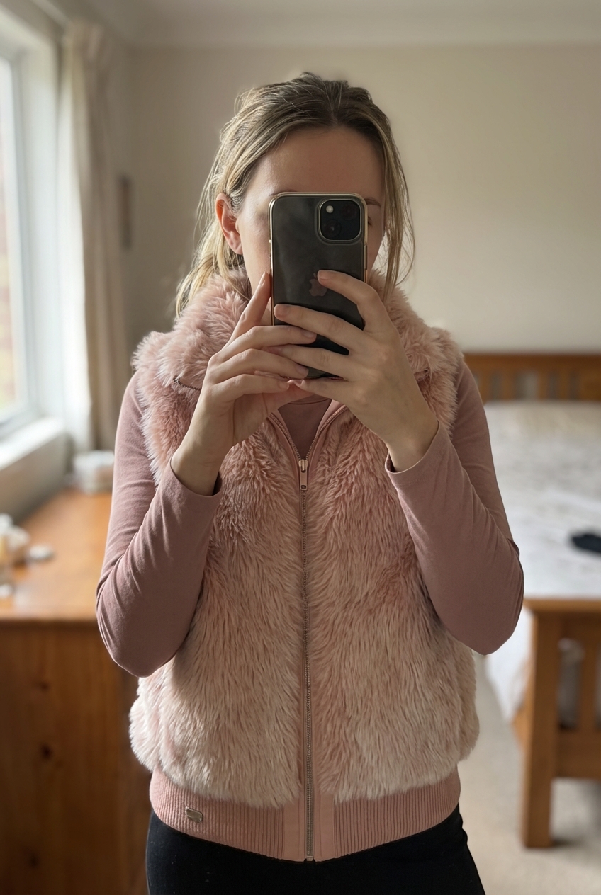 A person in Vintage Y2K faux fur pink gilet bodywarmer standing straight facing the camera, in a softly lit bedroom setting, with gentle natural light filtering through a window.