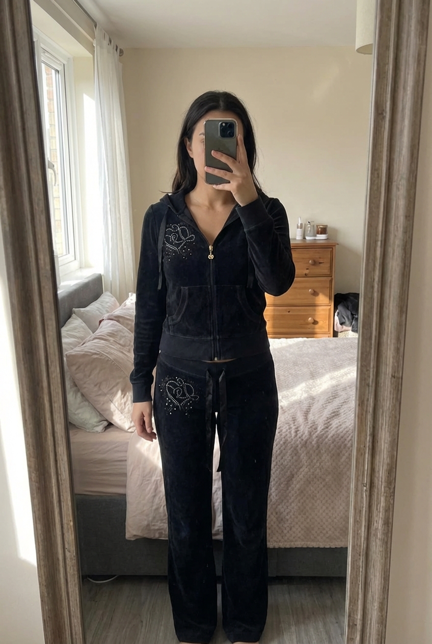A person in Vintage Y2K genuine black lipsy embellished tracksuit hoodie & low waisted flare joggers standing straight facing the camera, in a softly lit bedroom setting, with gentle natural light filtering through a window.