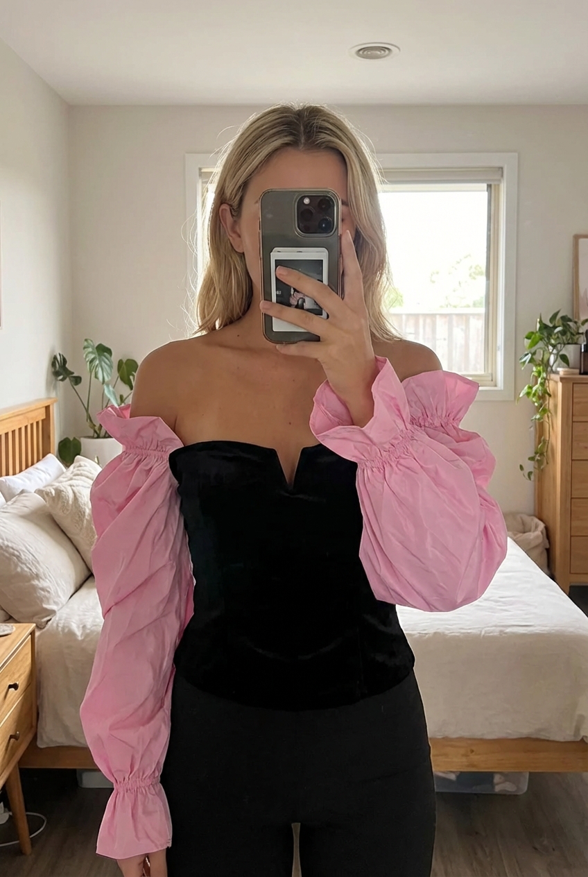 A person in Vintage Y2K indefeir black velvet corset top with pink balloon sleeves standing straight facing the camera, in a softly lit bedroom setting, with gentle natural light filtering through a window.