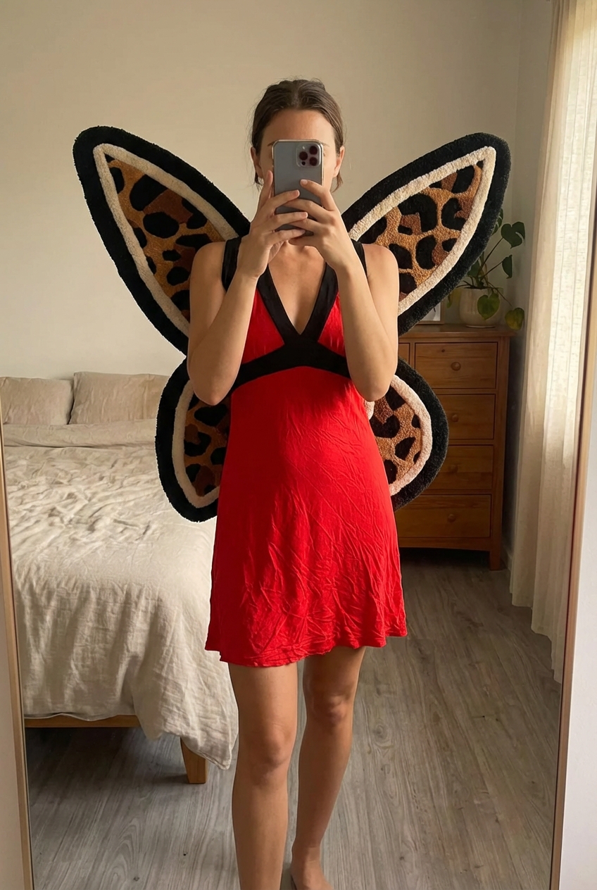 A person in Vintage Y2K Jane Norman black red halter neck mini dress standing straight facing the camera, in a softly lit bedroom setting, with gentle natural light filtering through a window.