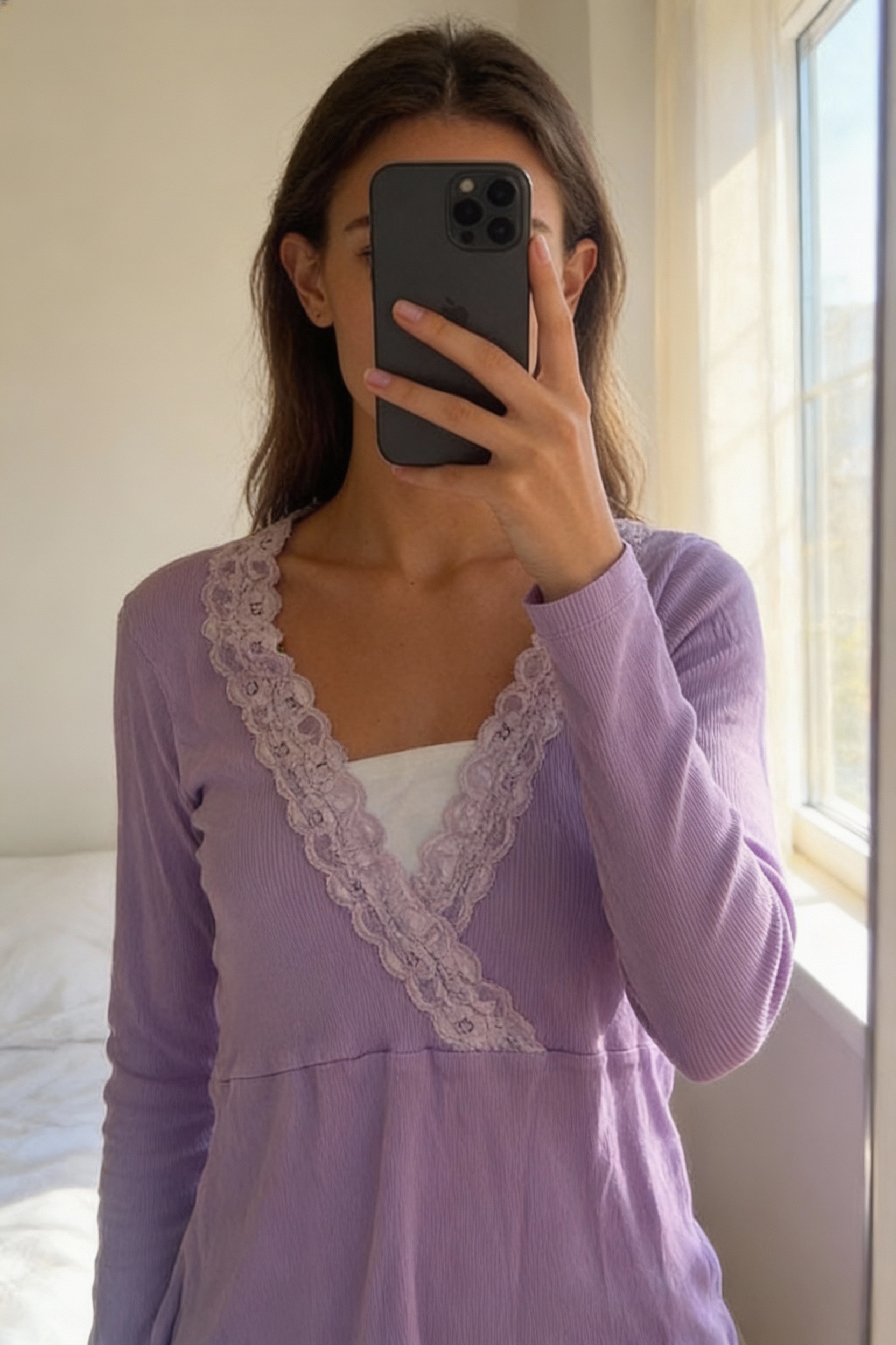 A person in Vintage Y2K lilac purple long sleeve lace trim top standing straight facing the camera, in a softly lit bedroom setting, with gentle natural light filtering through a window.