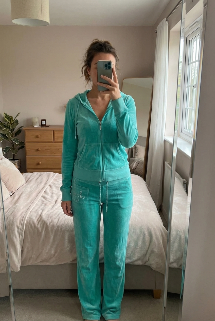 A person in Vintage Y2K Lipsy mint green turquoise embellished diamanté tracksuit standing straight facing the camera, in a softly lit bedroom setting, with gentle natural light filtering through a window.