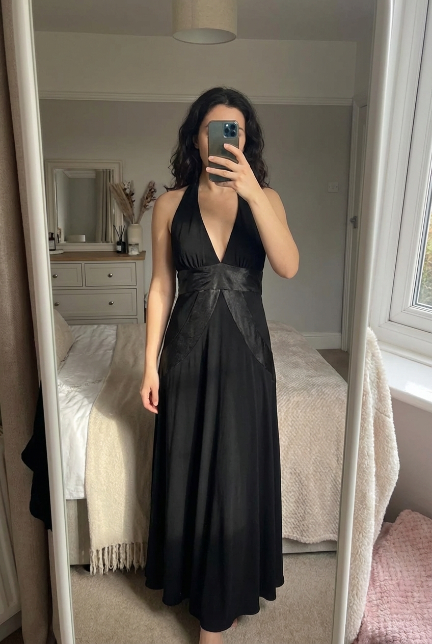 A person in Vintage Y2K Morgan black midi dress with satin details standing straight facing the camera, in a softly lit bedroom setting, with gentle natural light filtering through a window.
